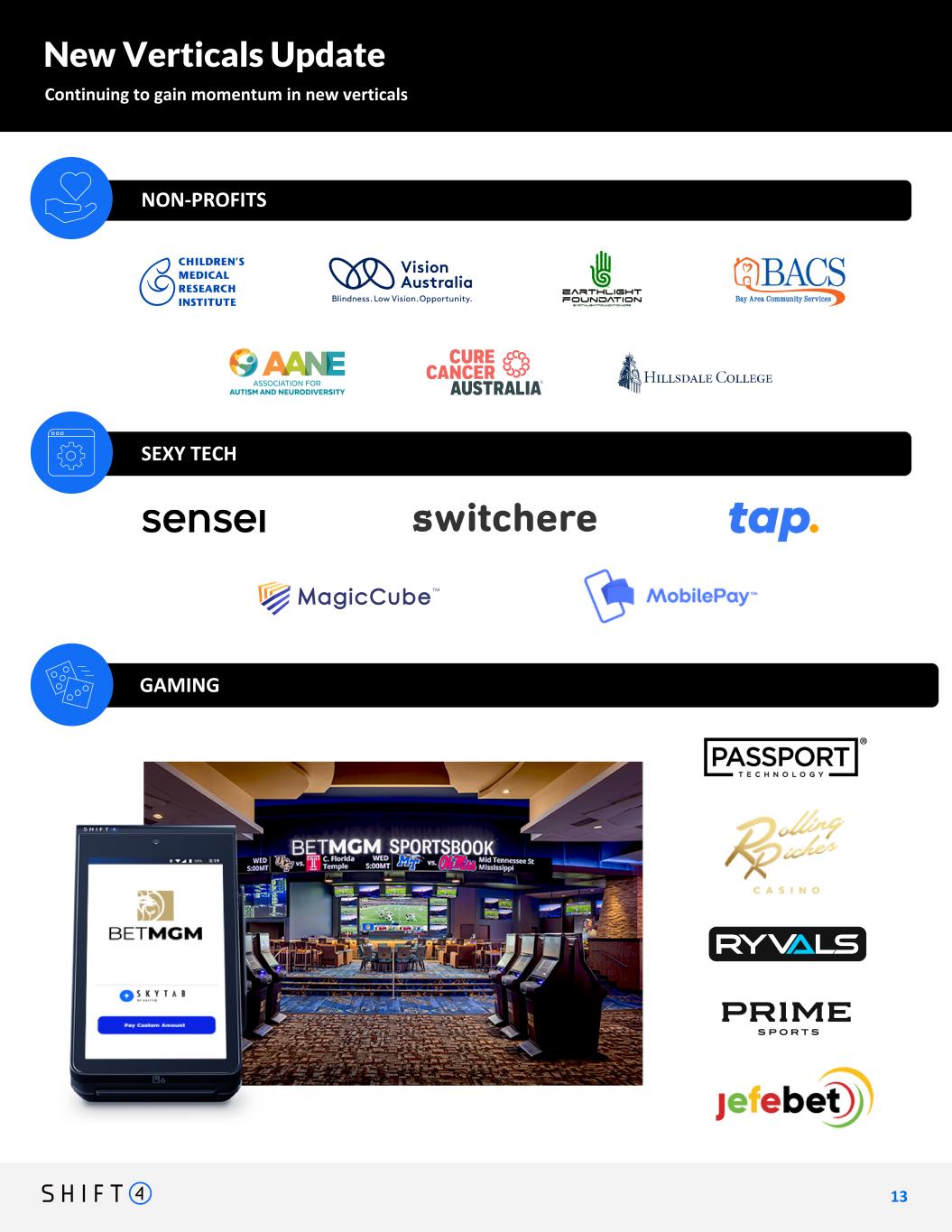 Under nonprofits add: Association for Autism and Neurodiversity, Cure Cancer Australia, Children's Medical Research Institute, Vision Australia, Earthlight Foundation, Bay Area Services, Hillsdale College New Verticals Update Continuing to gain momentum in new verticals 1 3 13 NON-PROFITS SEXY TECH GAMING In Europe, our relationship with online delivery platform Wolt is ramping extremely quickly. Wolt is a global leader in home delivery of essential items (food, convenience, etc.) Processing payments for Nayax, a European PSP focused on unattended retail-use-cases, including EV charging stations We entered into an agreement to process payments for Fortech, a PSP in Italy focused on fuel stations and EV charging stations throughout the country.we entered into an agreement to process payments for Fortech, a PSP in Italy focused on fuel stations and EV charging stations throughout the country. • in the process of rolling out SkyTab mobile devices through all of BetMGM's 24 sportsbooklocations across 9 states • SkyTab also being integrated with Passport Technology, a tech partner that enables cashless gaming experiences on the casino floor //// • Online gaming: ryvals.com (online gaming site targeting the interactive "competitive gamer" community); Prime Sports Betting (an online platform currently operating in Ohio & expanding); Jefebet (online betting platform customized exclusively for the underserved latino community); Rolling Riches (online gaming site blending social media with slot and casino-type games)