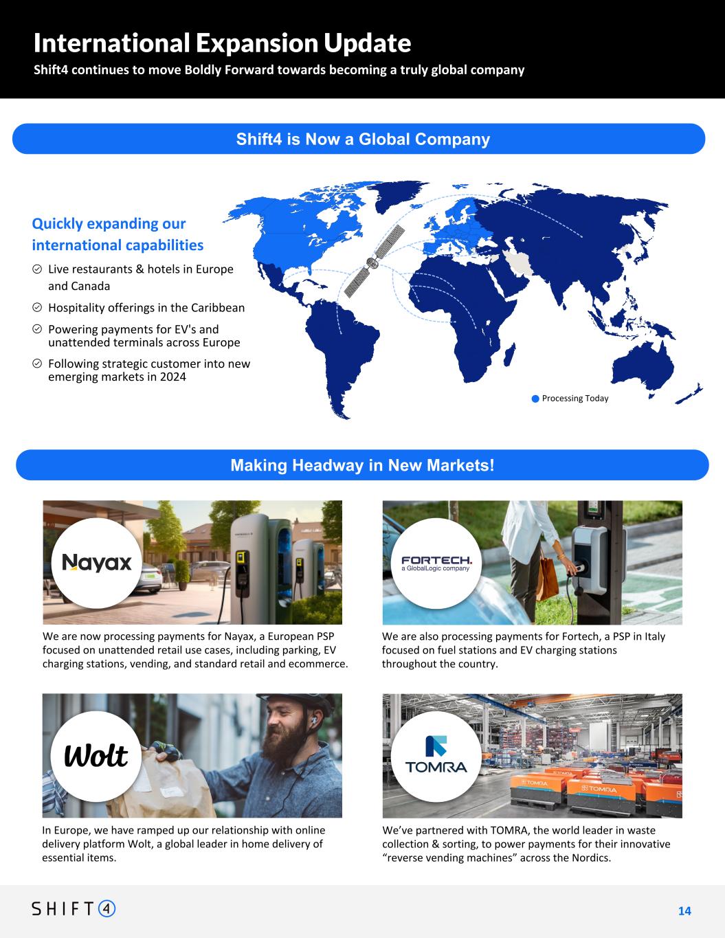 International Expansion Update Shift4 continues to move Boldly Forward towards becoming a truly global company 1 4 14 Things to touch on: – we closed on finaro. It's a much better business today. 1/3 of net revenue from existing customers, exiting 2023 at $45m+ of EBITDA, lots of card present capabilities with operation skytabs in europe – be explicit about: close collaboration, 20 months of inegration work, would have lifted Q3 organic net revenue growth to 27% – 2024 goal to add over 10,000 restaurants and hotels in Europe and Canada, including existing multi-billion GWO conversion opportunity Intended Message: The closing of Finaro facilitates our global expansion. The business looks very different than it did 20 months ago as a direct result of Shift4's influence highlight contrast vs. worldline add comment on M&A for distribution? (+ finaro charts from Luke?) 2024 GOAL & BEYOND Processing Today - Going forward, we plan to follow our strategic customer into new regions all around the world through a combination of partnerships and commercial integrations Making Headway in New Markets! In Europe, our relationship with online delivery platform Wolt is ramping extremely quickly. Wolt is a global leader in home delivery of essential items (food, convenience, etc.) Processing payments for Nayax, a European PSP focused on unattended retail-use-cases, including EV charging stations We entered into an agreement to process payments for Fortech, a PSP in Italy focused on fuel stations and EV charging stations throughout the country.we entered into an agreement to process payments for Fortech, a PSP in Italy focused on fuel stations and EV charging stations throughout the country. • Live restaurants & hotels in Europe and Canada • Hospitality offerings in the Caribbean • Powering payments for EV's and unattended terminals across Europe • Following strategic customer into new emerging markets in 2024 We are now processing payments for Nayax, a European PSP focused on unattended retail use cases, including parking, EV charging stations, vending, and standard retail and ecommerce. Shift4 is Now a Global Company We are also processing payments for Fortech, a PSP in Italy focused on fuel stations and EV charging stations throughout the country. In Europe, we have ramped up our relationship with online delivery platform Wolt, a global leader in home delivery of essential items. We’ve partnered with TOMRA, the world leader in waste collection & sorting, to power payments for their innovative “reverse vending machines” across the Nordics. Quickly expanding our international capabilities