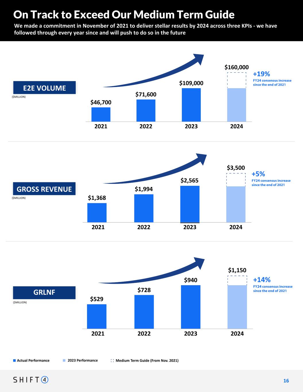 See page 2 for a description of non-GAAP financial measures. For a reconciliation of non-GAAP financial measures to the most directly comparable GAAP financial measures, please see the relevant tables in the "Appendix - Financial Information" of this document. Introducing Full Year 2024 Guidance We are providing full year 2024 guidance across our main KPIs 1 5 15 Intended Message: Adjusted for contribution from Finaro/Appetize, we're looking at 31% YoY GRLNF growth in Q4 $741 Million +38% YoY +42% YoY $766 Million Full Year Range: $2.60 Billion to $2.63 Billion Gross Revenue $1.30 Billion +38% YoY +44% YoY $1.35 BillionGross Revenue Less Network Fees We expect a total contribution of ~$21 million in GRLNF in the fourth quarter from Legacy Finaro and Appetize(C) $358+ Million 58%+ FCF Conversion Full Year Full Year Adjusted Free Cash Flow $167 Billion +53% YoY +68% YoY $183 BillionEnd-to-End Payment Volume $741 Million +38% YoY +42% YoY $766 MillionGross Revenue $635 Million +38% YoY +47% YoY $675 MillionAdjusted EBITDA $259+ Million Adjusted Free Cash Flow TO TO TO TO 57%+ FCF Conversion FY 2024 Guidance TBU 58%+ Adj. FCF Conversion
