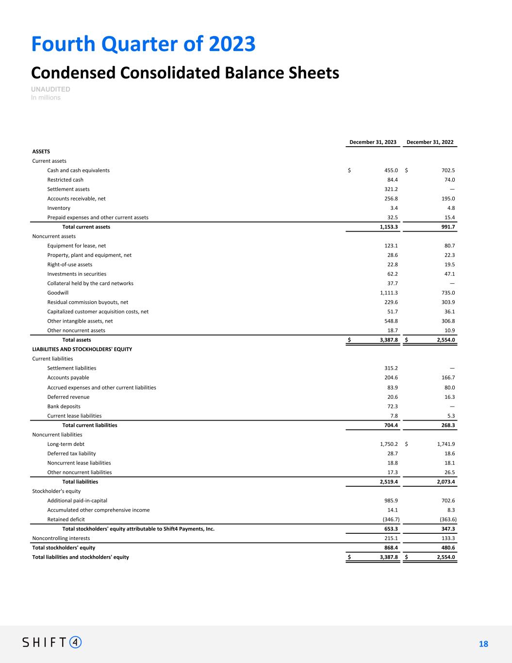 Fourth Quarter of 2023 Condensed Consolidated Balance Sheets UNAUDITED In millions December 31, 2023 December 31, 2022 ASSETS Current assets Cash and cash equivalents $ 455.0 $ 702.5 Restricted cash 84.4 74.0 Settlement assets 321.2 — Accounts receivable, net 256.8 195.0 Inventory 3.4 4.8 Prepaid expenses and other current assets 32.5 15.4 Total current assets 1,153.3 991.7 Noncurrent assets Equipment for lease, net 123.1 80.7 Property, plant and equipment, net 28.6 22.3 Right-of-use assets 22.8 19.5 Investments in securities 62.2 47.1 Collateral held by the card networks 37.7 — Goodwill 1,111.3 735.0 Residual commission buyouts, net 229.6 303.9 Capitalized customer acquisition costs, net 51.7 36.1 Other intangible assets, net 548.8 306.8 Other noncurrent assets 18.7 10.9 Total assets $ 3,387.8 $ 2,554.0 LIABILITIES AND STOCKHOLDERS' EQUITY Current liabilities Settlement liabilities 315.2 — Accounts payable 204.6 166.7 Accrued expenses and other current liabilities 83.9 80.0 Deferred revenue 20.6 16.3 Bank deposits 72.3 — Current lease liabilities 7.8 5.3 Total current liabilities 704.4 268.3 Noncurrent liabilities Long-term debt 1,750.2 $ 1,741.9 Deferred tax liability 28.7 18.6 Noncurrent lease liabilities 18.8 18.1 Other noncurrent liabilities 17.3 26.5 Total liabilities 2,519.4 2,073.4 Stockholder's equity Additional paid-in-capital 985.9 702.6 Accumulated other comprehensive income 14.1 8.3 Retained deficit (346.7) (363.6) Total stockholders' equity attributable to Shift4 Payments, Inc. 653.3 347.3 Noncontrolling interests 215.1 133.3 Total stockholders' equity 868.4 480.6 Total liabilities and stockholders' equity $ 3,387.8 $ 2,554.0 1 8 18