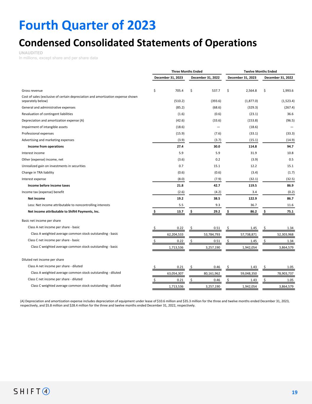 Fourth Quarter of 2023 Condensed Consolidated Statements of Operations UNAUDITED In millions, except share and per share data Three Months Ended Twelve Months Ended December 31, 2023 December 31, 2022 December 31, 2023 December 31, 2022 Gross revenue $ 705.4 $ 537.7 $ 2,564.8 $ 1,993.6 Cost of sales (exclusive of certain depreciation and amortization expense shown separately below) (510.2) (393.6) (1,877.0) (1,523.4) General and administrative expenses (85.2) (68.6) (329.3) (267.4) Revaluation of contingent liabilities (1.6) (0.6) (23.1) 36.6 Depreciation and amortization expense (A) (42.6) (33.6) (153.8) (96.5) Impairment of intangible assets (18.6) — (18.6) — Professional expenses (15.9) (7.6) (33.1) (33.3) Advertising and marketing expenses (3.9) (3.7) (15.1) (14.9) Income from operations 27.4 30.0 114.8 94.7 Interest income 5.9 5.9 31.9 10.8 Other (expense) income, net (3.6) 0.2 (3.9) 0.5 Unrealized gain on investments in securities 0.7 15.1 12.2 15.1 Change in TRA liability (0.6) (0.6) (3.4) (1.7) Interest expense (8.0) (7.9) (32.1) (32.5) Income before income taxes 21.8 42.7 119.5 86.9 Income tax (expense) benefit (2.6) (4.2) 3.4 (0.2) Net income 19.2 38.5 122.9 86.7 Less: Net income attributable to noncontrolling interests 5.5 9.3 36.7 11.6 Net income attributable to Shift4 Payments, Inc. $ 13.7 $ 29.2 $ 86.2 $ 75.1 Basic net income per share Class A net income per share - basic $ 0.22 $ 0.51 $ 1.45 $ 1.34 Class A weighted average common stock outstanding - basic 62,204,533 53,784,793 57,738,871 52,303,968 Class C net income per share - basic $ 0.22 $ 0.51 $ 1.45 $ 1.34 Class C weighted average common stock outstanding - basic 1,713,536 3,257,190 1,942,054 3,864,579 Diluted net income per share Class A net income per share - diluted $ 0.21 $ 0.46 $ 1.43 $ 1.05 Class A weighted average common stock outstanding - diluted 63,054,307 80,161,962 59,048,350 78,903,737 Class C net income per share - diluted $ 0.21 $ 0.46 $ 1.43 $ 1.05 Class C weighted average common stock outstanding - diluted 1,713,536 3,257,190 1,942,054 3,864,579 (A) Depreciation and amortization expense includes depreciation of equipment under lease of $10.6 million and $35.3 million for the three and twelve months ended December 31, 2023, respectively, and $5.8 million and $28.4 million for the three and twelve months ended December 31, 2022, respectively. 1 9 19