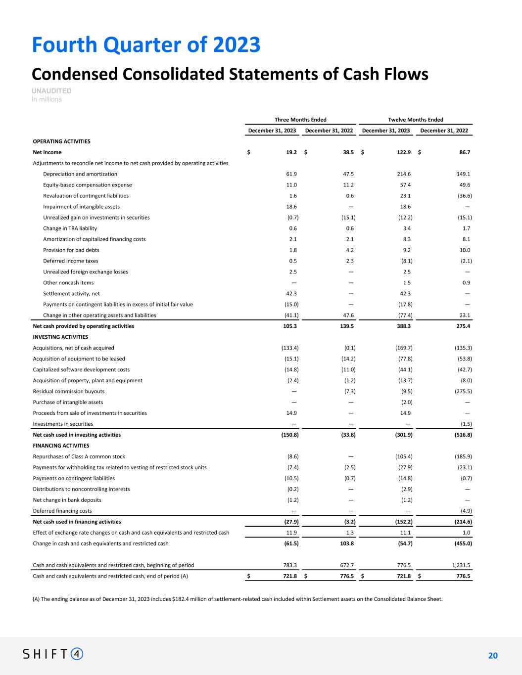 Fourth Quarter of 2023 Condensed Consolidated Statements of Cash Flows UNAUDITED In millions Three Months Ended Twelve Months Ended December 31, 2023 December 31, 2022 December 31, 2023 December 31, 2022 OPERATING ACTIVITIES Net income $ 19.2 $ 38.5 $ 122.9 $ 86.7 Adjustments to reconcile net income to net cash provided by operating activities Depreciation and amortization 61.9 47.5 214.6 149.1 Equity-based compensation expense 11.0 11.2 57.4 49.6 Revaluation of contingent liabilities 1.6 0.6 23.1 (36.6) Impairment of intangible assets 18.6 — 18.6 — Unrealized gain on investments in securities (0.7) (15.1) (12.2) (15.1) Change in TRA liability 0.6 0.6 3.4 1.7 Amortization of capitalized financing costs 2.1 2.1 8.3 8.1 Provision for bad debts 1.8 4.2 9.2 10.0 Deferred income taxes 0.5 2.3 (8.1) (2.1) Unrealized foreign exchange losses 2.5 — 2.5 — Other noncash items — — 1.5 0.9 Settlement activity, net 42.3 — 42.3 — Payments on contingent liabilities in excess of initial fair value (15.0) — (17.8) — Change in other operating assets and liabilities (41.1) 47.6 (77.4) 23.1 Net cash provided by operating activities 105.3 139.5 388.3 275.4 INVESTING ACTIVITIES Acquisitions, net of cash acquired (133.4) (0.1) (169.7) (135.3) Acquisition of equipment to be leased (15.1) (14.2) (77.8) (53.8) Capitalized software development costs (14.8) (11.0) (44.1) (42.7) Acquisition of property, plant and equipment (2.4) (1.2) (13.7) (8.0) Residual commission buyouts — (7.3) (9.5) (275.5) Purchase of intangible assets — — (2.0) — Proceeds from sale of investments in securities 14.9 — 14.9 — Investments in securities — — — (1.5) Net cash used in investing activities (150.8) (33.8) (301.9) (516.8) FINANCING ACTIVITIES Repurchases of Class A common stock (8.6) — (105.4) (185.9) Payments for withholding tax related to vesting of restricted stock units (7.4) (2.5) (27.9) (23.1) Payments on contingent liabilities (10.5) (0.7) (14.8) (0.7) Distributions to noncontrolling interests (0.2) — (2.9) — Net change in bank deposits (1.2) — (1.2) — Deferred financing costs — — — (4.9) Net cash used in financing activities (27.9) (3.2) (152.2) (214.6) Effect of exchange rate changes on cash and cash equivalents and restricted cash 11.9 1.3 11.1 1.0 Change in cash and cash equivalents and restricted cash (61.5) 103.8 (54.7) (455.0) Cash and cash equivalents and restricted cash, beginning of period 783.3 672.7 776.5 1,231.5 Cash and cash equivalents and restricted cash, end of period (A) $ 721.8 $ 776.5 $ 721.8 $ 776.5 2 0 20 (A) The ending balance as of December 31, 2023 includes $182.4 million of settlement-related cash included within Settlement assets on the Consolidated Balance Sheet.