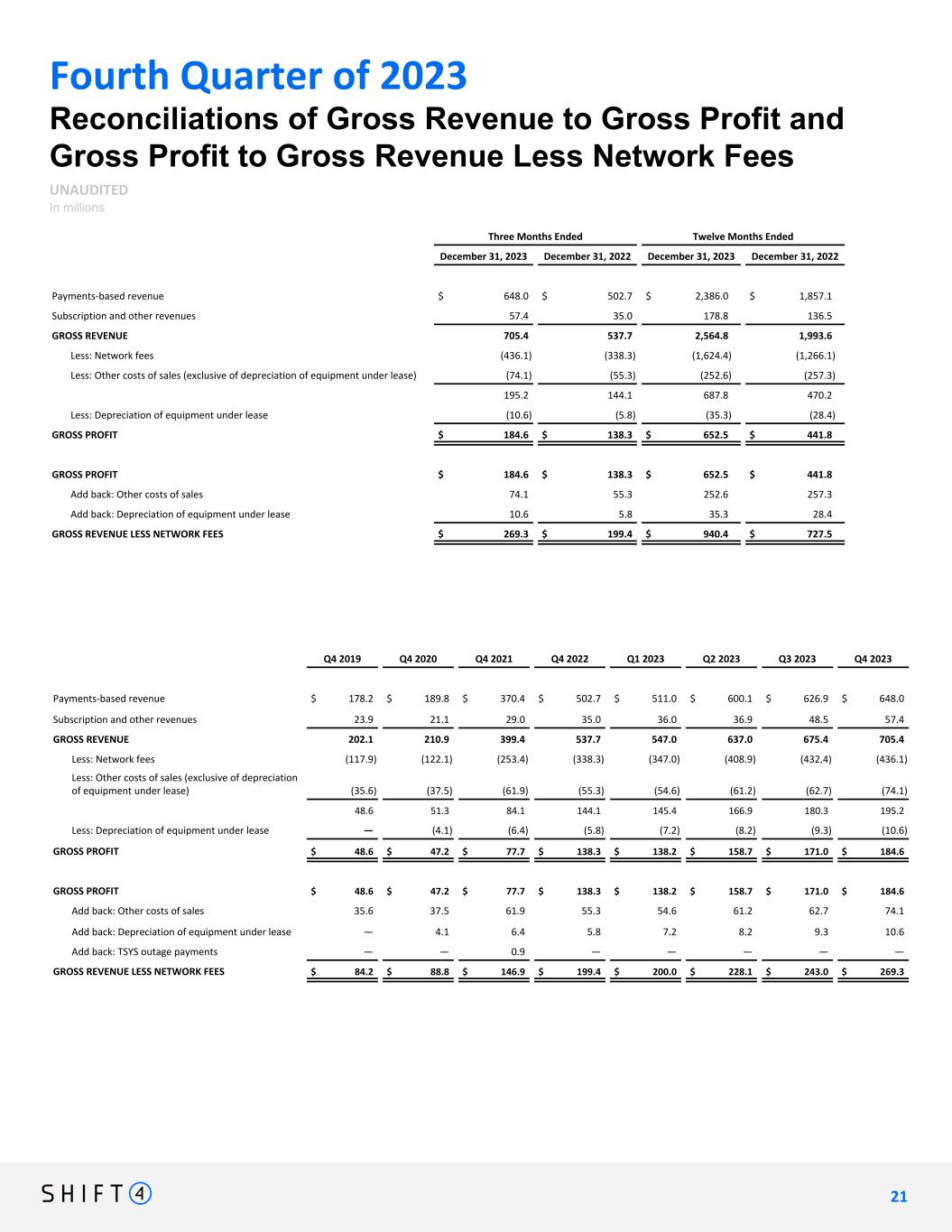 Fourth Quarter of 2023 Reconciliations of Gross Revenue to Gross Profit and Gross Profit to Gross Revenue Less Network Fees UNAUDITED In millions Three Months Ended Twelve Months Ended December 31, 2023 December 31, 2022 December 31, 2023 December 31, 2022 Payments-based revenue $ 648.0 $ 502.7 $ 2,386.0 $ 1,857.1 Subscription and other revenues 57.4 35.0 178.8 136.5 GROSS REVENUE 705.4 537.7 2,564.8 1,993.6 Less: Network fees (436.1) (338.3) (1,624.4) (1,266.1) Less: Other costs of sales (exclusive of depreciation of equipment under lease) (74.1) (55.3) (252.6) (257.3) 195.2 144.1 687.8 470.2 Less: Depreciation of equipment under lease (10.6) (5.8) (35.3) (28.4) GROSS PROFIT $ 184.6 $ 138.3 $ 652.5 $ 441.8 GROSS PROFIT $ 184.6 $ 138.3 $ 652.5 $ 441.8 Add back: Other costs of sales 74.1 55.3 252.6 257.3 Add back: Depreciation of equipment under lease 10.6 5.8 35.3 28.4 GROSS REVENUE LESS NETWORK FEES $ 269.3 $ 199.4 $ 940.4 $ 727.5 Q4 2019 Q4 2020 Q4 2021 Q4 2022 Q1 2023 Q2 2023 Q3 2023 Q4 2023 Payments-based revenue $ 178.2 $ 189.8 $ 370.4 $ 502.7 $ 511.0 $ 600.1 $ 626.9 $ 648.0 Subscription and other revenues 23.9 21.1 29.0 35.0 36.0 36.9 48.5 57.4 GROSS REVENUE 202.1 210.9 399.4 537.7 547.0 637.0 675.4 705.4 Less: Network fees (117.9) (122.1) (253.4) (338.3) (347.0) (408.9) (432.4) (436.1) Less: Other costs of sales (exclusive of depreciation of equipment under lease) (35.6) (37.5) (61.9) (55.3) (54.6) (61.2) (62.7) (74.1) 48.6 51.3 84.1 144.1 145.4 166.9 180.3 195.2 Less: Depreciation of equipment under lease — (4.1) (6.4) (5.8) (7.2) (8.2) (9.3) (10.6) GROSS PROFIT $ 48.6 $ 47.2 $ 77.7 $ 138.3 $ 138.2 $ 158.7 $ 171.0 $ 184.6 GROSS PROFIT $ 48.6 $ 47.2 $ 77.7 $ 138.3 $ 138.2 $ 158.7 $ 171.0 $ 184.6 Add back: Other costs of sales 35.6 37.5 61.9 55.3 54.6 61.2 62.7 74.1 Add back: Depreciation of equipment under lease — 4.1 6.4 5.8 7.2 8.2 9.3 10.6 Add back: TSYS outage payments — — 0.9 — — — — — GROSS REVENUE LESS NETWORK FEES $ 84.2 $ 88.8 $ 146.9 $ 199.4 $ 200.0 $ 228.1 $ 243.0 $ 269.3 2 1 21