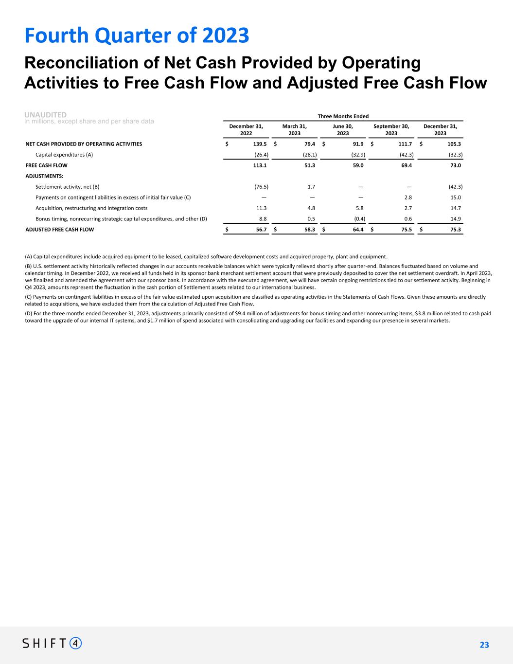 Three Months Ended December 31, 2022 March 31, 2023 June 30, 2023 September 30, 2023 December 31, 2023 NET CASH PROVIDED BY OPERATING ACTIVITIES $ 139.5 $ 79.4 $ 91.9 $ 111.7 $ 105.3 Capital expenditures (A) (26.4) (28.1) (32.9) (42.3) (32.3) FREE CASH FLOW 113.1 51.3 59.0 69.4 73.0 ADJUSTMENTS: Settlement activity, net (B) (76.5) 1.7 — — (42.3) Payments on contingent liabilities in excess of initial fair value (C) — — — 2.8 15.0 Acquisition, restructuring and integration costs 11.3 4.8 5.8 2.7 14.7 Bonus timing, nonrecurring strategic capital expenditures, and other (D) 8.8 0.5 (0.4) 0.6 14.9 ADJUSTED FREE CASH FLOW $ 56.7 $ 58.3 $ 64.4 $ 75.5 $ 75.3 Reconciliation of Net Cash Provided by Operating Activities to Free Cash Flow and Adjusted Free Cash Flow UNAUDITED In millions, except share and per share data Fourth Quarter of 2023 (A) Capital expenditures include acquired equipment to be leased, capitalized software development costs and acquired property, plant and equipment. (B) U.S. settlement activity historically reflected changes in our accounts receivable balances which were typically relieved shortly after quarter-end. Balances fluctuated based on volume and calendar timing. In December 2022, we received all funds held in its sponsor bank merchant settlement account that were previously deposited to cover the net settlement overdraft. In April 2023, we finalized and amended the agreement with our sponsor bank. In accordance with the executed agreement, we will have certain ongoing restrictions tied to our settlement activity. Beginning in Q4 2023, amounts represent the fluctuation in the cash portion of Settlement assets related to our international business. (C) Payments on contingent liabilities in excess of the fair value estimated upon acquisition are classified as operating activities in the Statements of Cash Flows. Given these amounts are directly related to acquisitions, we have excluded them from the calculation of Adjusted Free Cash Flow. (D) For the three months ended December 31, 2023, adjustments primarily consisted of $9.4 million of adjustments for bonus timing and other nonrecurring items, $3.8 million related to cash paid toward the upgrade of our internal IT systems, and $1.7 million of spend associated with consolidating and upgrading our facilities and expanding our presence in several markets. 2 3 23