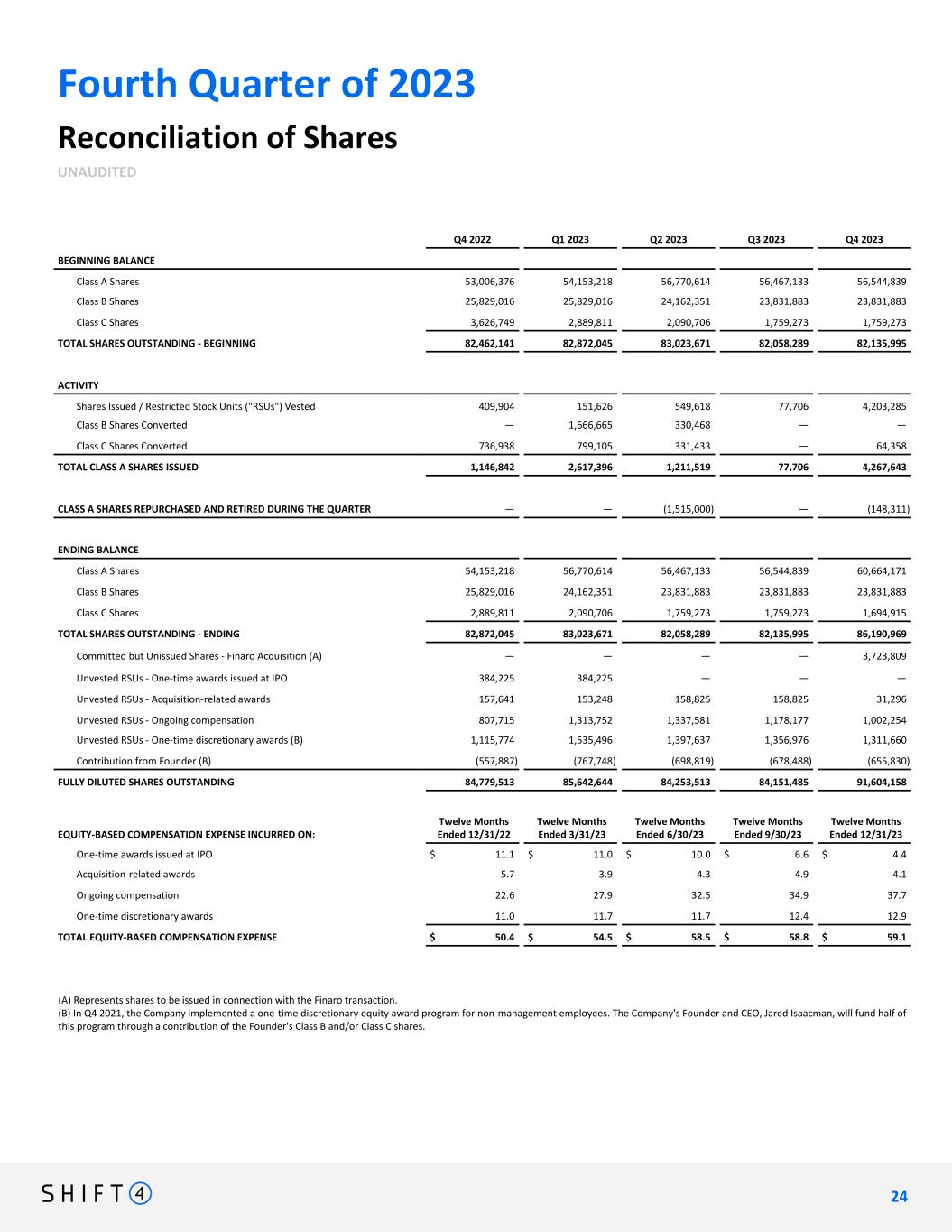 Fourth Quarter of 2023 Reconciliation of Shares UNAUDITED Q4 2022 Q1 2023 Q2 2023 Q3 2023 Q4 2023 BEGINNING BALANCE Class A Shares 53,006,376 54,153,218 56,770,614 56,467,133 56,544,839 Class B Shares 25,829,016 25,829,016 24,162,351 23,831,883 23,831,883 Class C Shares 3,626,749 2,889,811 2,090,706 1,759,273 1,759,273 TOTAL SHARES OUTSTANDING - BEGINNING 82,462,141 82,872,045 83,023,671 82,058,289 82,135,995 ACTIVITY Shares Issued / Restricted Stock Units ("RSUs") Vested 409,904 151,626 549,618 77,706 4,203,285 Class B Shares Converted — 1,666,665 330,468 — — Class C Shares Converted 736,938 799,105 331,433 — 64,358 TOTAL CLASS A SHARES ISSUED 1,146,842 2,617,396 1,211,519 77,706 4,267,643 CLASS A SHARES REPURCHASED AND RETIRED DURING THE QUARTER — — (1,515,000) — (148,311) ENDING BALANCE Class A Shares 54,153,218 56,770,614 56,467,133 56,544,839 60,664,171 Class B Shares 25,829,016 24,162,351 23,831,883 23,831,883 23,831,883 Class C Shares 2,889,811 2,090,706 1,759,273 1,759,273 1,694,915 TOTAL SHARES OUTSTANDING - ENDING 82,872,045 83,023,671 82,058,289 82,135,995 86,190,969 Committed but Unissued Shares - Finaro Acquisition (A) — — — — 3,723,809 Unvested RSUs - One-time awards issued at IPO 384,225 384,225 — — — Unvested RSUs - Acquisition-related awards 157,641 153,248 158,825 158,825 31,296 Unvested RSUs - Ongoing compensation 807,715 1,313,752 1,337,581 1,178,177 1,002,254 Unvested RSUs - One-time discretionary awards (B) 1,115,774 1,535,496 1,397,637 1,356,976 1,311,660 Contribution from Founder (B) (557,887) (767,748) (698,819) (678,488) (655,830) FULLY DILUTED SHARES OUTSTANDING 84,779,513 85,642,644 84,253,513 84,151,485 91,604,158 EQUITY-BASED COMPENSATION EXPENSE INCURRED ON: Twelve Months Ended 12/31/22 Twelve Months Ended 3/31/23 Twelve Months Ended 6/30/23 Twelve Months Ended 9/30/23 Twelve Months Ended 12/31/23 One-time awards issued at IPO $ 11.1 $ 11.0 $ 10.0 $ 6.6 $ 4.4 Acquisition-related awards 5.7 3.9 4.3 4.9 4.1 Ongoing compensation 22.6 27.9 32.5 34.9 37.7 One-time discretionary awards 11.0 11.7 11.7 12.4 12.9 TOTAL EQUITY-BASED COMPENSATION EXPENSE $ 50.4 $ 54.5 $ 58.5 $ 58.8 $ 59.1 (A) Represents shares to be issued in connection with the Finaro transaction. (B) In Q4 2021, the Company implemented a one-time discretionary equity award program for non-management employees. The Company's Founder and CEO, Jared Isaacman, will fund half of this program through a contribution of the Founder's Class B and/or Class C shares. 2 4 24
