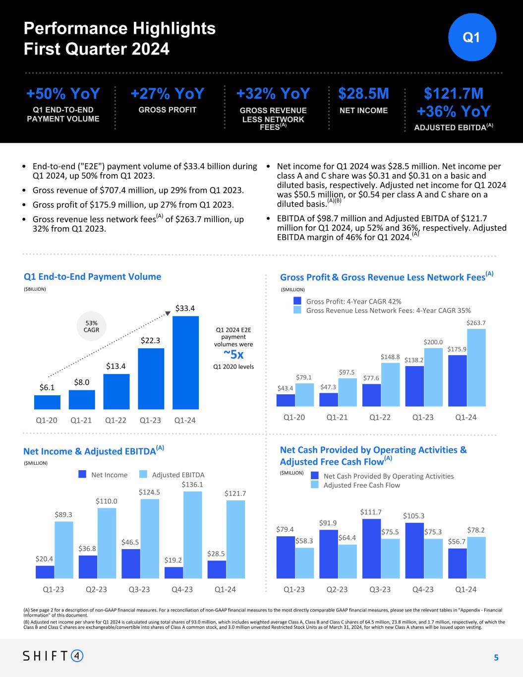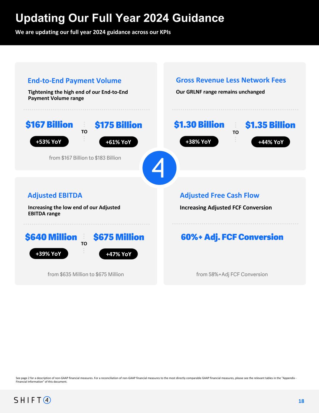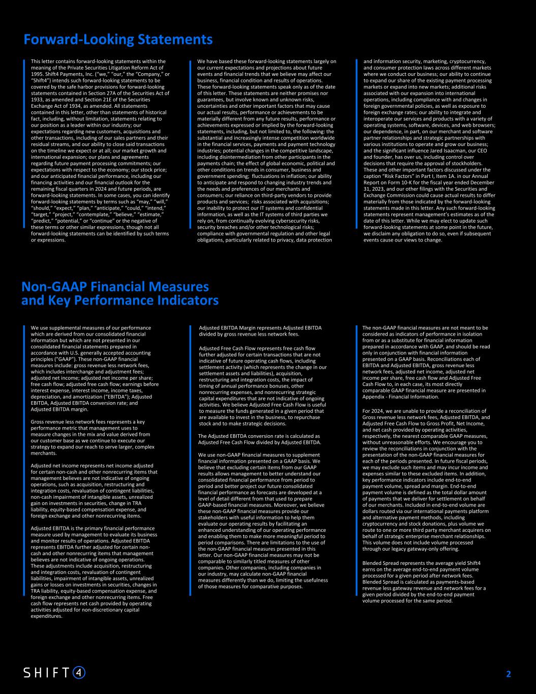 Non-GAAP Financial Measures and Key Performance Indicators Forward-Looking Statements We use supplemental measures of our performance which are derived from our consolidated financial information but which are not presented in our consolidated financial statements prepared in accordance with U.S. generally accepted accounting principles ("GAAP"). These non-GAAP financial measures include: gross revenue less network fees, which includes interchange and adjustment fees; adjusted net income; adjusted net income per share; free cash flow; adjusted free cash flow; earnings before interest expense, interest income, income taxes, depreciation, and amortization (“EBITDA”); Adjusted EBITDA, Adjusted EBITDA conversion rate; and Adjusted EBITDA margin. Gross revenue less network fees represents a key performance metric that management uses to measure changes in the mix and value derived from our customer base as we continue to execute our strategy to expand our reach to serve larger, complex merchants. Adjusted net income represents net income adjusted for certain non-cash and other nonrecurring items that management believes are not indicative of ongoing operations, such as acquisition, restructuring and integration costs, revaluation of contingent liabilities, non-cash impairment of intangible assets, unrealized gain on investments in securities, change in TRA liability, equity-based compensation expense, and foreign exchange and other nonrecurring items. Adjusted EBITDA is the primary financial performance measure used by management to evaluate its business and monitor results of operations. Adjusted EBITDA represents EBITDA further adjusted for certain non- cash and other nonrecurring items that management believes are not indicative of ongoing operations. These adjustments include acquisition, restructuring and integration costs, revaluation of contingent liabilities, impairment of intangible assets, unrealized gains or losses on investments in securities, changes in TRA liability, equity-based compensation expense, and foreign exchange and other nonrecurring items. Free cash flow represents net cash provided by operating activities adjusted for non-discretionary capital expenditures. Adjusted EBITDA Margin represents Adjusted EBITDA divided by gross revenue less network fees. Adjusted Free Cash Flow represents free cash flow further adjusted for certain transactions that are not indicative of future operating cash flows, including settlement activity (which represents the change in our settlement assets and liabilities), acquisition, restructuring and integration costs, the impact of timing of annual performance bonuses, other nonrecurring expenses, and nonrecurring strategic capital expenditures that are not indicative of ongoing activities. We believe Adjusted Free Cash Flow is useful to measure the funds generated in a given period that are available to invest in the business, to repurchase stock and to make strategic decisions. The Adjusted EBITDA conversion rate is calculated as Adjusted Free Cash Flow divided by Adjusted EBITDA. We use non-GAAP financial measures to supplement financial information presented on a GAAP basis. We believe that excluding certain items from our GAAP results allows management to better understand our consolidated financial performance from period to period and better project our future consolidated financial performance as forecasts are developed at a level of detail different from that used to prepare GAAP-based financial measures. Moreover, we believe these non-GAAP financial measures provide our stakeholders with useful information to help them evaluate our operating results by facilitating an enhanced understanding of our operating performance and enabling them to make more meaningful period to period comparisons. There are limitations to the use of the non-GAAP financial measures presented in this letter. Our non-GAAP financial measures may not be comparable to similarly titled measures of other companies. Other companies, including companies in our industry, may calculate non-GAAP financial measures differently than we do, limiting the usefulness of those measures for comparative purposes. We have based these forward-looking statements largely on our current expectations and projections about future events and financial trends that we believe may affect our business, financial condition and results of operations. These forward-looking statements speak only as of the date of this letter. These statements are neither promises nor guarantees, but involve known and unknown risks, uncertainties and other important factors that may cause our actual results, performance or achievements to be materially different from any future results, performance or achievements expressed or implied by the forward-looking statements, including, but not limited to, the following: the substantial and increasingly intense competition worldwide in the financial services, payments and payment technology industries; potential changes in the competitive landscape, including disintermediation from other participants in the payments chain; the effect of global economic, political and other conditions on trends in consumer, business and government spending; fluctuations in inflation; our ability to anticipate and respond to changing industry trends and the needs and preferences of our merchants and consumers; our reliance on third-party vendors to provide products and services; risks associated with acquisitions; our inability to protect our IT systems and confidential information, as well as the IT systems of third parties we rely on, from continually evolving cybersecurity risks, security breaches and/or other technological risks; compliance with governmental regulation and other legal obligations, particularly related to privacy, data protection The non-GAAP financial measures are not meant to be considered as indicators of performance in isolation from or as a substitute for f