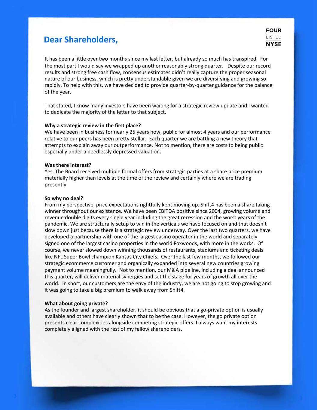 Dear Shareholders, 3 3 Jared Isaacman CEO jared@shift4.com circulated via email NOTE: THIS IS WORD DOC v9 FOR VERSION CONTROL - CHANGES WILL BE MADE IN WORD DOCS & PASTED HERE It has been a little over two months since my last letter, but already so much has transpired. For the most part I would say we wrapped up another reasonably strong quarter. Despite our record results and strong free cash flow, consensus estimates didn’t really capture the proper seasonal nature of our business, which is pretty understandable given we are diversifying and growing so rapidly. To help with this, we have decided to provide quarter-by-quarter guidance for the balance of the year. That stated, I know many investors have been waiting for a strategic review update and I wanted to dedicate the majority of the letter to that subject. Why a strategic review in the first place? We have been in business for nearly 25 years now, public for almost 4 years and our performance relative to our peers has been pretty stellar. Each quarter we are battling a new theory that attempts to explain away our outperformance. Not to mention, there are costs to being public especially under a needlessly depressed valuation. Was there interest? Yes. The Board received multiple formal offers from strategic parties at a share price premium materially higher than levels at the time of the review and certainly where we are trading presently. So why no deal? From my perspective, price expectations rightfully kept moving up. Shift4 has been a share taking winner throughout our existence. We have been EBITDA positive since 2004, growing volume and revenue double digits every single year including the great recession and the worst years of the pandemic. We are structurally setup to win in the verticals we have focused on and that doesn’t slow down just because there is a strategic review underway. Over the last two quarters, we have developed a partnership with one of the largest casino operator in the world and separately signed one of the largest casino properties in the world Foxwoods, with more in the works. Of course, we never slowed down winning thousands of restaurants, stadiums and ticketing deals like NFL Super Bowl champion Kansas City Chiefs. Over the last few months, we followed our strategic ecommerce customer and organically expanded into several new countries growing payment volume meaningfully. Not to mention, our M&A pipeline, including a deal announced this quarter, will deliver material synergies and set the stage for years of growth all over the world. In short, our customers are the envy of the industry, we are not going to stop growing and it was going to take a big premium to walk away from Shift4. What about going private? As the founder and largest shareholder, it should be obvious that a go-private option is usually available and others have clearly shown that to be the case. However, the go private option presents clear complexities alongside competing strategic offers. I always want my interests completely aligned with the rest of my fellow shareholders.