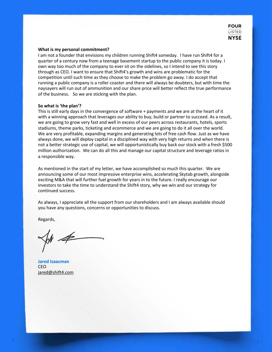 What is my personal commitment? I am not a founder that envisions my children running Shift4 someday. I have run Shift4 for a quarter of a century now from a teenage basement startup to the public company it is today. I own way too much of the company to ever sit on the sidelines, so I intend to see this story through as CEO. I want to ensure that Shift4’s growth and wins are problematic for the competition until such time as they choose to make the problem go away. I do accept that running a public company is a roller coaster and there will always be doubters, but with time the naysayers will run out of ammunition and our share price will better reflect the true performance of the business. So we are sticking with the plan. So what is ‘the plan’? This is still early days in the convergence of software + payments and we are at the heart of it with a winning approach that leverages our ability to buy, build or partner to succeed. As a result, we are going to grow very fast and well in excess of our peers across restaurants, hotels, sports stadiums, theme parks, ticketing and ecommerce and we are going to do it all over the world. We are very profitable, expanding margins and generating lots of free cash flow. Just as we have always done, we will deploy capital in a disciplined way with very high returns and when there is not a better strategic use of capital, we will opportunistically buy back our stock with a fresh $500 million authorization. We can do all this and manage our capital structure and leverage ratios in a responsible way. As mentioned in the start of my letter, we have accomplished so much this quarter. We are announcing some of our most impressive enterprise wins, accelerating Skytab growth, alongside exciting M&A that will further fuel growth for years in to the future. I really encourage our investors to take the time to understand the Shift4 story, why we win and our strategy for continued success. As always, I appreciate all the support from our shareholders and I am always available should you have any questions, concerns or opportunities to discuss. Regards, Jared Isaacman CEO jared@shift4.com 4 4