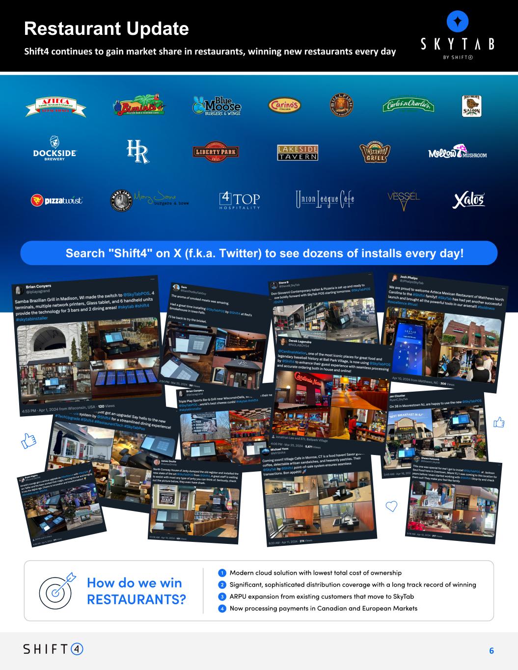 We are winning in the restaurant space because our merchants love our product suite 7 Intended Message: The rollout of SkyTab is accelerating, recent promotions are resonating with merchants who increasingly sensitive to cost• Highlight restaurants posted on Twitter/X and highlight ~5 operational sites in the UK (call this out) • NO location count updates • Provide commentary regarding consistent production, or accelerated production, something to provide confidence on our growth in USA and now UK/ Europe • Consider including some of the restaurant betas that Rohan is working in Canada? SkyTab is a Best in Class Product [ADD?]: 2024 Goal: install over 30,000 SKyTab POS systems domestically SkyTab POS Systems Installed 38% system install growth QoQ Online Ordering Loyalty Program Marketing Tools Reservations InCharge Mobile App QR Code Solutions Reporting & Analytics Third Party Marketplace Local Onsite Support 24/7 Phone & Chat Support Lifetime Hardware Replacements Onsite Installation AI Website Builder Business Intelligence Kiosk Our Merchants Get Far More Than Just a Premiere POS System with SkyTab... The Below Features Are Included – All for Free! NEW! NEW! try another version of this aesthetically Ahead of schedule for 30,000 system installs in the U.S. in 2024 55% Restaurant SaaS growth