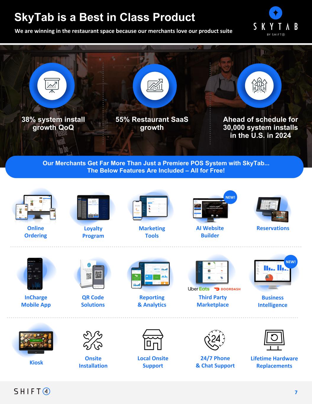 Shift4 continues to gain market share in restaurants, winning new restaurants every day 6 Intended Message: The rollout of SkyTab is accelerating, recent promotions are resonating with merchants who increasingly sensitive to cost • Highlight restaurants posted on Twitter/X and highlight ~5 operational sites in the UK (call this out) • NO location count updates • Provide commentary regarding consistent production, or accelerated production, something to provide confidence on our growth in USA and now UK/ Europe • Consider including some of the restaurant betas that Rohan is working in Canada? Restaurant Update [ADD?]: 2024 Goal: install over 30,000 SKyTab POS systems domestically Search "Shift4" on X (f.k.a. Twitter) to see dozens of installs every day!