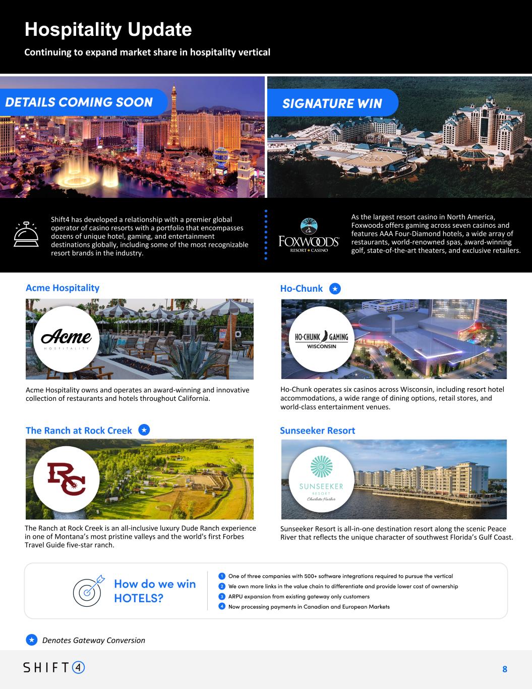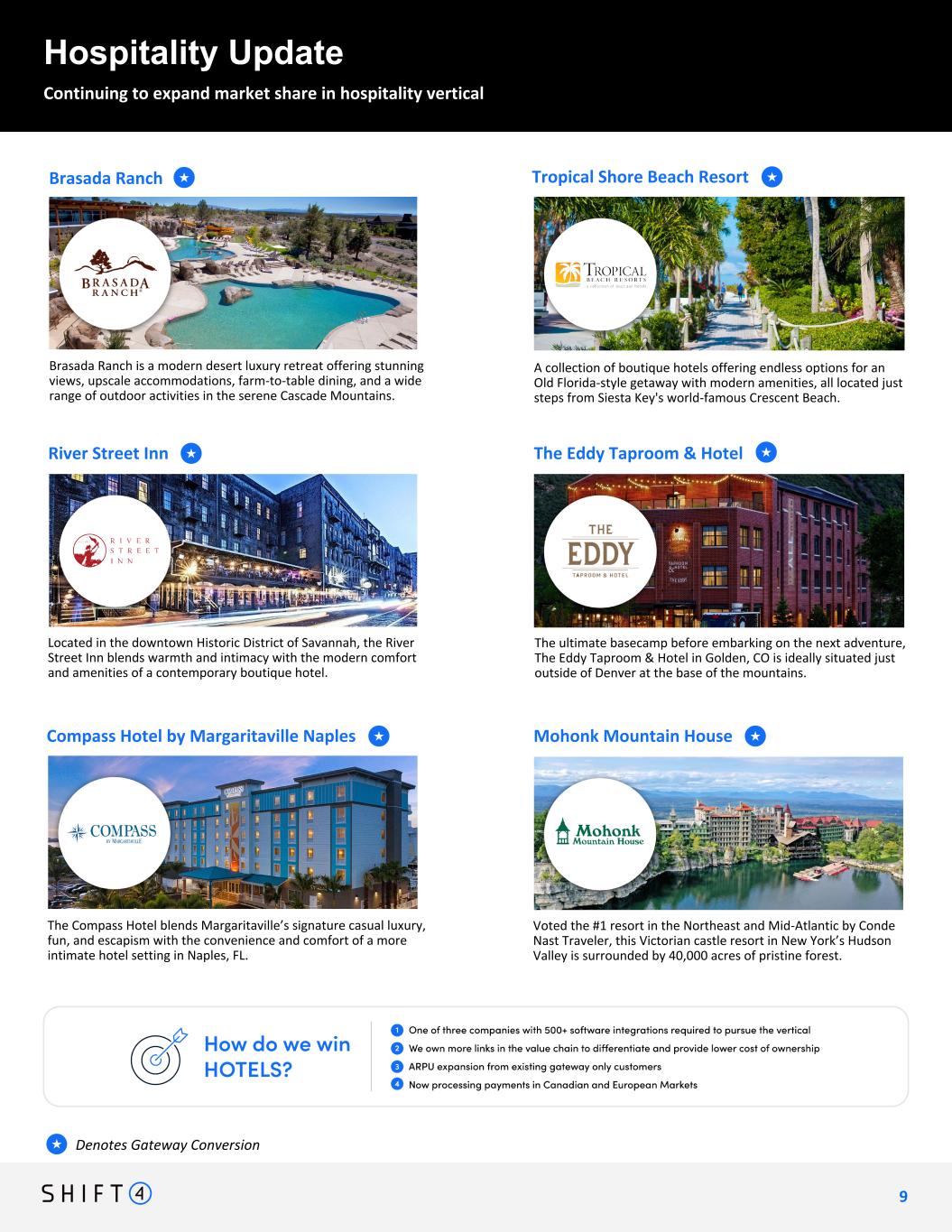 Continuing to expand market share in hospitality vertical Hospitality Update Denotes Gateway Conversion★ 8 8 • Highlight MGM properties • Carter Hospitality • + others ** still considering Sizzle video 1 or 2 or 3 signature win + 4 HOTELS: • Signature: Foxwoods + WYNN? • others: ◦ Acme Hospitality ◦ Ho-Chunk (GWO conversion) ◦ The Ranch at Rock Creek (GWO conversion) ◦ Sunseeker Resort (net new) Ho-Chunk operates six casinos across Wisconsin, including resort hotel accommodations, a wide range of dining options, retail stores, and world-class entertainment venues. Ho-Chunk The Ranch at Rock Creek is an all-inclusive luxury Dude Ranch experience in one of Montana’s most pristine valleys and the world's first Forbes Travel Guide five-star ranch. The Ranch at Rock Creek Sunseeker Resort is all-in-one destination resort along the scenic Peace River that reflects the unique character of southwest Florida’s Gulf Coast. Sunseeker Resort Acme Hospitality owns and operates an award-winning and innovative collection of restaurants and hotels throughout California. Acme Hospitality As the largest resort casino in North America, Foxwoods offers gaming across seven casinos and features AAA Four-Diamond hotels, a wide array of restaurants, world-renowned spas, award-winning golf, state-of-the-art theaters, and exclusive retailers. ★ ★ Shift4 has developed a relationship with a premier global operator of casino resorts with a portfolio that encompasses dozens of unique hotel, gaming, and entertainment destinations globally, including some of the most recognizable resort brands in the industry. use other pic?