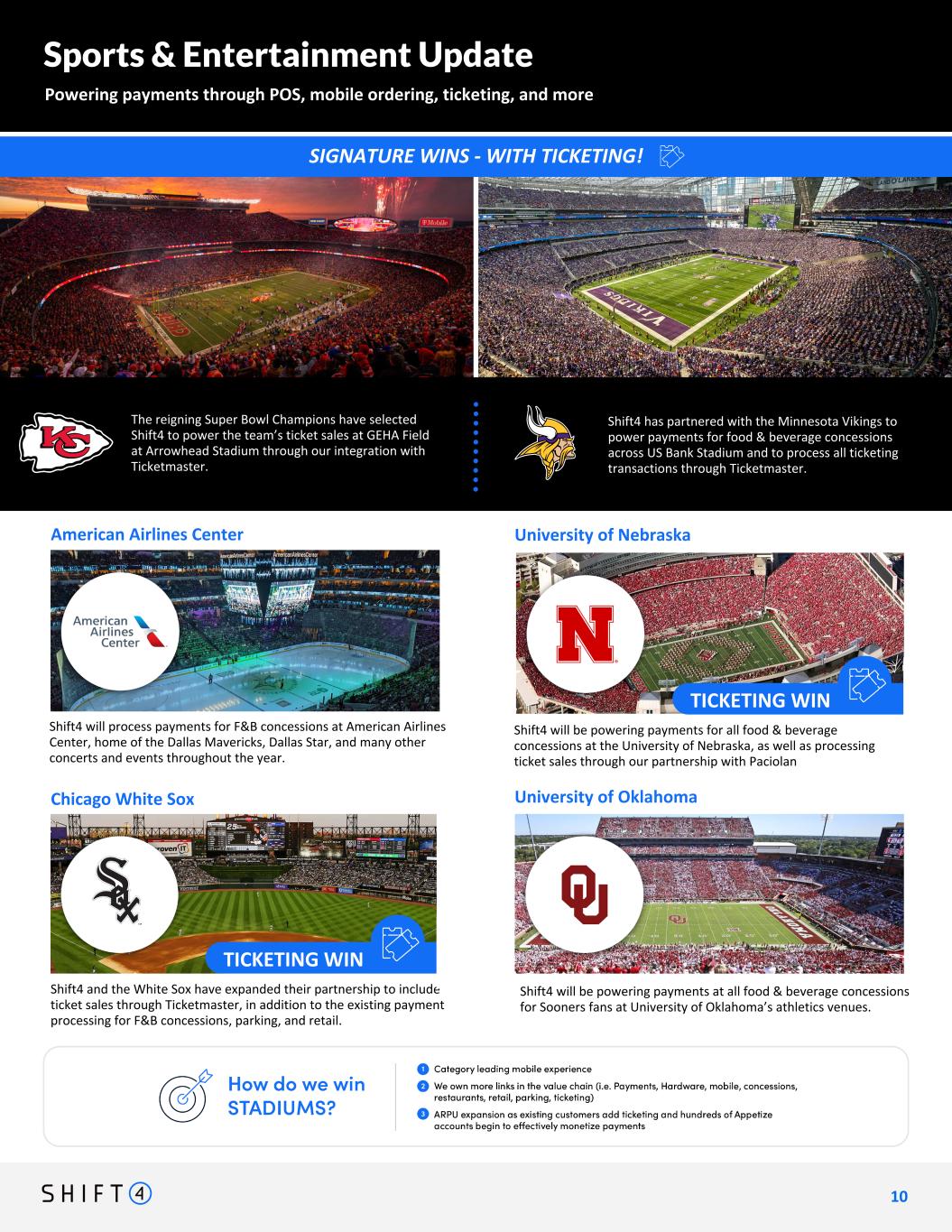 American Airlines Center Sports & Entertainment Update Powering payments through POS, mobile ordering, ticketing, and more 1 0 10 Shift4 will process payments for F&B concessions at American Airlines Center, home of the Dallas Mavericks, Dallas Star, and many other concerts and events throughout the year. University of Oklahoma University of Nebraska Shift4 and the White Sox have expanded their partnership to include ticket sales through Ticketmaster, in addition to the existing payment processing for F&B concessions, parking, and retail. Chicago White Sox TICKETING WIN 6 S&E wins • American Airlines Center (Dallas) - Appetize conversion • Chiefs - TM ticketing • White Sox - added ticketing (TM) • Vikings / US Bank Stadium - F&B Appetize conversion + ticketing • San Jose Sharks? - Appetize conversion • Tennessee Titans - ticketing upsell? Shift4 has partnered with the Minnesota Vikings to power payments for food & beverage concessions across US Bank Stadium and to process all ticketing transactions through Ticketmaster. The reigning Super Bowl Champions have selected Shift4 to power the team’s ticket sales at GEHA Field at Arrowhead Stadium through our integration with Ticketmaster. American Airlines Center Chicago White Sox SIGNATURE WINS - WITH TICKETING! PM to CHECK! Shift4 will be powering payments at all food & beverage concessions for Sooners fans at University of Oklahoma’s athletics venues. TICKETING WIN Shift4 will be powering payments for all food & beverage concessions at the University of Nebraska, as well as processing ticket sales through our partnership with Paciolan