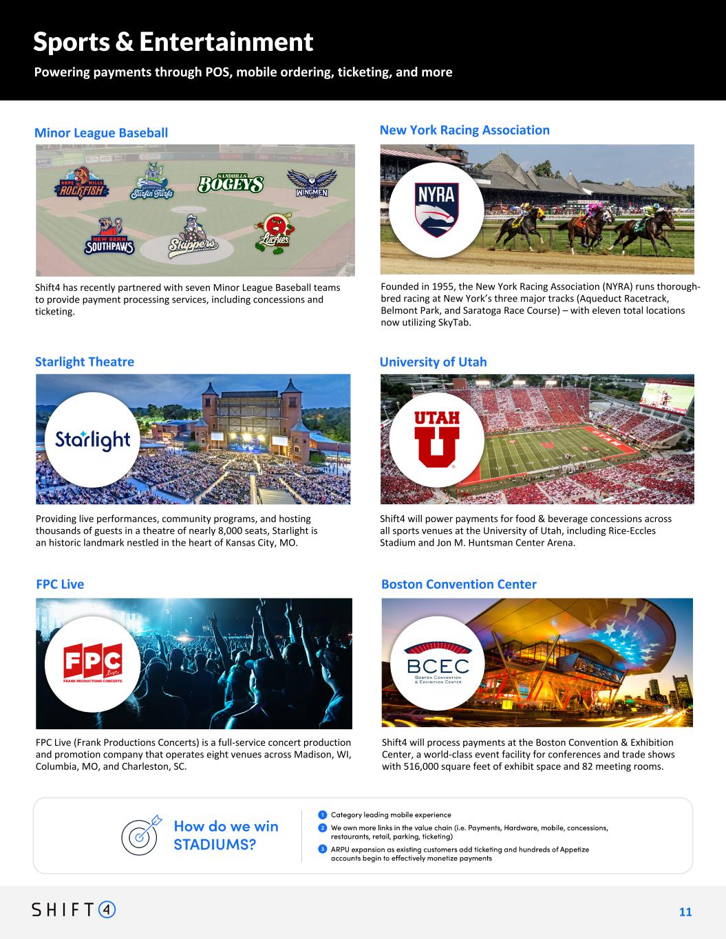 Minor League Baseball Sports & Entertainment Powering payments through POS, mobile ordering, ticketing, and more 1 1 11 University of Utah Shift4 has recently partnered with seven Minor League Baseball teams to provide payment processing services, including concessions and ticketing. Boston Convention Center FPC Live (Frank Productions Concerts) is a full-service concert production and promotion company that operates eight venues across Madison, WI, Columbia, MO, and Charleston, SC. FPC Live Providing live performances, community programs, and hosting thousands of guests in a theatre of nearly 8,000 seats, Starlight is an historic landmark nestled in the heart of Kansas City, MO. Starlight Theatre New York Racing Association Shift4 will process payments at the Boston Convention & Exhibition Center, a world-class event facility for conferences and trade shows with 516,000 square feet of exhibit space and 82 meeting rooms. Founded in 1955, the New York Racing Association (NYRA) runs thorough- bred racing at New York’s three major tracks (Aqueduct Racetrack, Belmont Park, and Saratoga Race Course) – with eleven total locations now utilizing SkyTab. Shift4 will power payments for food & beverage concessions across all sports venues at the University of Utah, including Rice-Eccles Stadium and Jon M. Huntsman Center Arena.