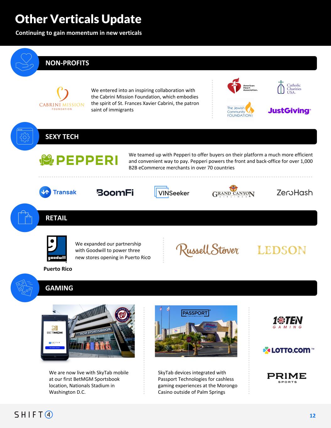 Under nonprofits add: Association for Autism and Neurodiversity, Cure Cancer Australia, Children's Medical Research Institute, Vision Australia, Earthlight Foundation, Bay Area Services, Hillsdale College Other Verticals Update Continuing to gain momentum in new verticals 1 2 12 NON-PROFITS SEXY TECH GAMING In Europe, our relationship with online delivery platform Wolt is ramping extremely quickly. Wolt is a global leader in home delivery of essential items (food, convenience, etc.) Processing payments for Nayax, a European PSP focused on unattended retail-use-cases, including EV charging stations We entered into an agreement to process payments for Fortech, a PSP in Italy focused on fuel stations and EV charging stations throughout the country.we entered into an agreement to process payments for Fortech, a PSP in Italy focused on fuel stations and EV charging stations throughout the country. • in the process of rolling out SkyTab mobile devices through all of BetMGM's 24 sportsbooklocations across 9 states • SkyTab also being integrated with Passport Technology, a tech partner that enables cashless gaming experiences on the casino floor //// • Online gaming: ryvals.com (online gaming site targeting the interactive "competitive gamer" community); Prime Sports Betting (an online platform currently operating in Ohio & expanding); Jefebet (online betting platform customized exclusively for the underserved latino community); Rolling Riches (online gaming site blending social media with slot and casino-type games) RETAIL << TBU >> RETAIL - Russell Stover, Ledson Winery, Goodwill Puerto Rico NON PROFITS - JustGiving, Jewish Community Foundation, Catholic Charity Fund, American Heart Association, World Food Programme SEXY TECH - Pepperi, Vinseeker, Boomfi, Transak, Goldengate, Zero Hash, Grand Canyon Airline GAMING — SkyTab mobile at BetMGM sportsbook at location Nationals Stadium, Passport technology at Morongo Casino, Lotto.com, Prime Sports Betting, 10 Ten Gaming Puerto Rico We teamed up with Pepperi to offer buyers on their platform a much more efficient and convenient way to pay. Pepperi powers the front and back-office for over 1,000 B2B eCommerce merchants in over 70 countries We expanded our partnership with Goodwill to power three new stores opening in Puerto Rico We entered into an inspiring collaboration with the Cabrini Mission Foundation, which embodies the spirit of St. Frances Xavier Cabrini, the patron saint of immigrants We are now live with SkyTab mobile at our first BetMGM Sportsbook location, Nationals Stadium in Washington D.C. SkyTab devices integrated with Passport Technologies for cashless gaming experiences at the Morongo Casino outside of Palm Springs