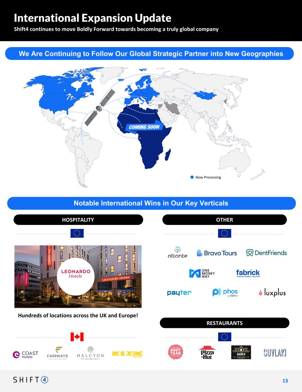 International Expansion Update Shift4 continues to move Boldly Forward towards becoming a truly global company 1 3 13 Things to touch on: – we closed on finaro. It's a much better business today. 1/3 of net revenue from existing customers, exiting 2023 at $45m+ of EBITDA, lots of card present capabilities with operation skytabs in europe – be explicit about: close collaboration, 20 months of inegration work, would have lifted Q3 organic net revenue growth to 27% – 2024 goal to add over 10,000 restaurants and hotels in Europe and Canada, including existing multi-billion GWO conversion opportunity Intended Message: The closing of Finaro facilitates our global expansion. The business looks very different than it did 20 months ago as a direct result of Shift4's influence highlight contrast vs. worldline add comment on M&A for distribution? (+ finaro charts from Luke?) 2024 GOAL & BEYOND - Going forward, we plan to follow our strategic customer into new regions all around the world through a combination of partnerships and commercial integrations In Europe, our relationship with online delivery platform Wolt is ramping extremely quickly. Wolt is a global leader in home delivery of essential items (food, convenience, etc.) Processing payments for Nayax, a European PSP focused on unattended retail-use-cases, including EV charging stations We entered into an agreement to process payments for Fortech, a PSP in Italy focused on fuel stations and EV charging stations throughout the country.we entered into an agreement to process payments for Fortech, a PSP in Italy focused on fuel stations and EV charging stations throughout the country. • Live restaurants & hotels in Europe and Canada • Hospitality offerings in the Caribbean • Powering payments for EV's and unattended terminals across Europe • Following strategic customer into new emerging markets in 2024 We Are Continuing to Follow Our Global Strategic Partner into New Geographies Quickly expanding our international capabilities BIG MAP W/ FLAGS + NEW REGIONS will need to light up new geographic areas in map! -af ican continent - highly likely -mongolia + albania - definite -additional regions?? international wins by vertical -restuarants (in google doc + add 2 intl screenshots) -hospitality (in hidden hotel pg we already maid) -retail (luxplus) -S&E (YES in lude Barca) -new verticals ( in google doc under "europe") TBU Now Processing Now Processing in 2024 RESTAURANTS HOSPITALITY OTHER Notable International Wins in Our Key Verticals Hundreds of locations across the UK and Europe!