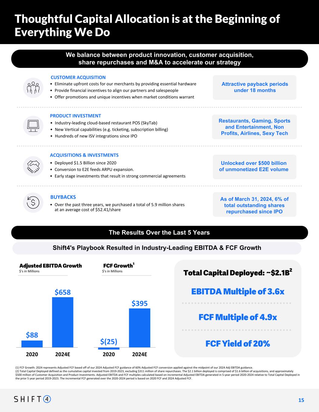 Restaurants, Gaming, Sports and Entertainment, Non Profits, Airlines, Sexy Tech Shift4's Playbook Resulted in Industry-Leading EBITDA & FCF Growth (1) FCF Growth: 2024 represents Adjusted FCF based off of our 2024 Adjusted FCF guidance of 60% Adjusted FCF conversion applied against the midpoint of our 2024 Adj EBITDA guidance. (2) Total Capital Deployed defined as the cumulative capital invested from 2019-2023, excluding $311 million of share repurchases. The $2.1 billion deployed is comprised of $1.6 billion of acquisitions, and approximately $500 million of Customer Acquisition and Product Investments. Adjusted EBITDA and FCF multiples calculated based on incremental Adjusted EBITDA generated in 5-year period 2020-2024 relative to Total Capital Deployed in the prior 5 year period 2019-2023. The incremental FCF generated over the 2020-2024 period is based on 2020 FCF and 2024 Adjusted FCF. 1 5 15 2024 GOAL & BEYOND We balance between product innovation, customer acquisition, share repurchases and M&A to accelerate our strategy Thoughtful Capital Allocation is at the Beginning of Everything We Do CUSTOMER ACQUISITION • Industry-leading cloud-based restaurant POS (SkyTab) • New Vertical capabilities (e.g. ticketing, subscription billing) • Hundreds of new ISV integrations since IPO Buybacks Acquisitions and Investments PRODUCT INVESTMENT • Eliminate upfront costs for our merchants by providing essential hardware • Provide financial incentives to align our partners and salespeople • Offer promotions and unique incentives when market conditions warrant • Deployed $1.5 Billion since 2020 • Conversion to E2E feeds ARPU expansion. • Early stage investments that result in strong commercial agreements • Over the past three years, we purchased a total of 5.9 million shares at an average cost of $52.41/share The Results Over the Last 5 Years Adjusted EBITDA Growth THE RESULTS Cumulative Incremental FCF Generated $278 Million FCF of 14% Cumulative Capital Invested ($'s in Millions) FCF Growth1 EBITDA Multiple of 3.6x THE RESULTS Cumulative Incremental FCF Generated FCF Multiple of 4.9x FCF Yield of 20% Total Capital Deployed: ~$2.1B2$'s in Millions $'s in Millions Attractive payback periods under 18 months Unlocked over $500 billion of unmonetized E2E volume 6% of total outstanding shares repurchased since IPO ACQUISITIONS & INVESTMENTS • Deployed $1.5 Billion since 2020 • Conversion to E2E feeds ARPU expansion. • Early stage investments that result in strong commercial agreements Unlocked over $500 billion of unmonetized E2E volume BUYBACKS • Over the past three years, we purchased a total of 5.9 million shares at an average cost of $52.41/share As of March 31, 2024, 6% of total outstanding shares repurchased since IPO