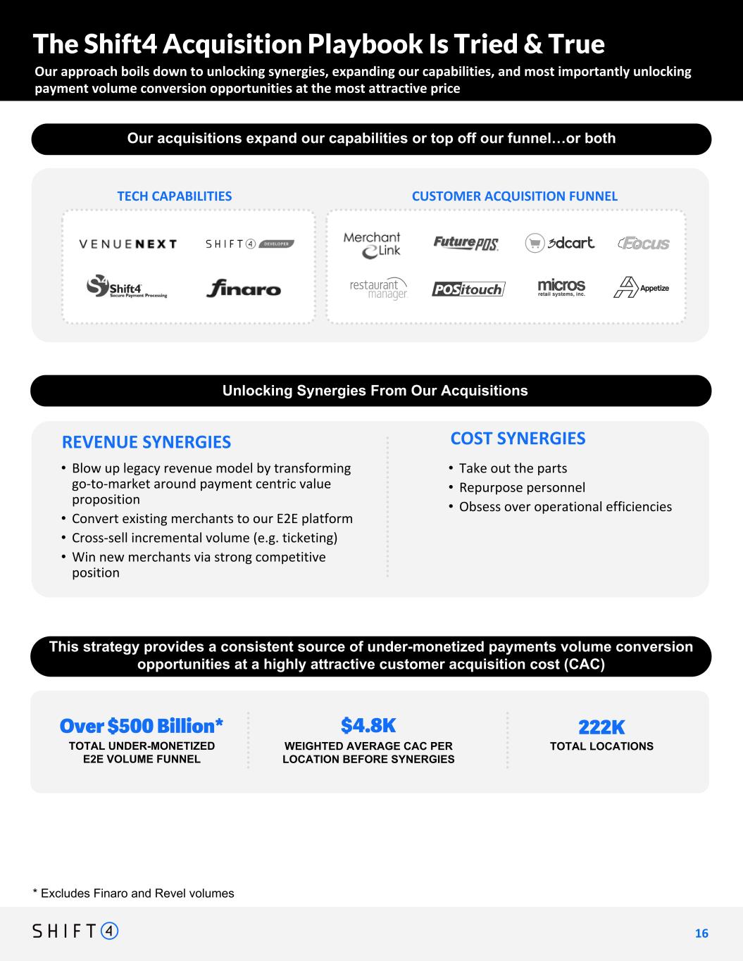 Over $500 Billion* 222K TOTAL UNDER-MONETIZED E2E VOLUME FUNNEL TOTAL LOCATIONS $4.8K WEIGHTED AVERAGE CAC PER LOCATION BEFORE SYNERGIES * Excludes Finaro and Revel volumes The Shift4 Acquisition Playbook Is Tried & True Our approach boils down to unlocking synergies, expanding our capabilities, and most importantly unlocking payment volume conversion opportunities at the most attractive price 1 6 16 highlight contrast vs. worldline add comment on M&A for distribution? (+ finaro charts from Luke?) 2024 GOAL & BEYOND EBITDA Multiple: 5.3x FCF Yield: 14% • Take out the parts • Repurpose personnel • Obsess over operational efficiencies COST SYNERGIESREVENUE SYNERGIES Unlocking Synergies From Our Acquisitions • Blow up legacy revenue model by transforming go-to-market around payment centric value proposition • Convert existing merchants to our E2E platform • Cross-sell incremental volume (e.g. ticketing) • Win new merchants via strong competitive position Our acquisitions either expand our capabilities or top off our funnel... This strategy provides a consistent source of under-monetized payments volume conversion opportunities at a highly attractive customer acquisition cost (CAC) arrow here leading to punchline Our acquisitions provide a consistent source of under monetized payment opportunities to convert merchants onto our end-to-end platform at highly attractive customer acquisition cost (CAC) TECH CAPABILITIES CUSTOMER ACQUISITION FUNNEL Our acquisitions expand our capabilities or top off our funnel…or both