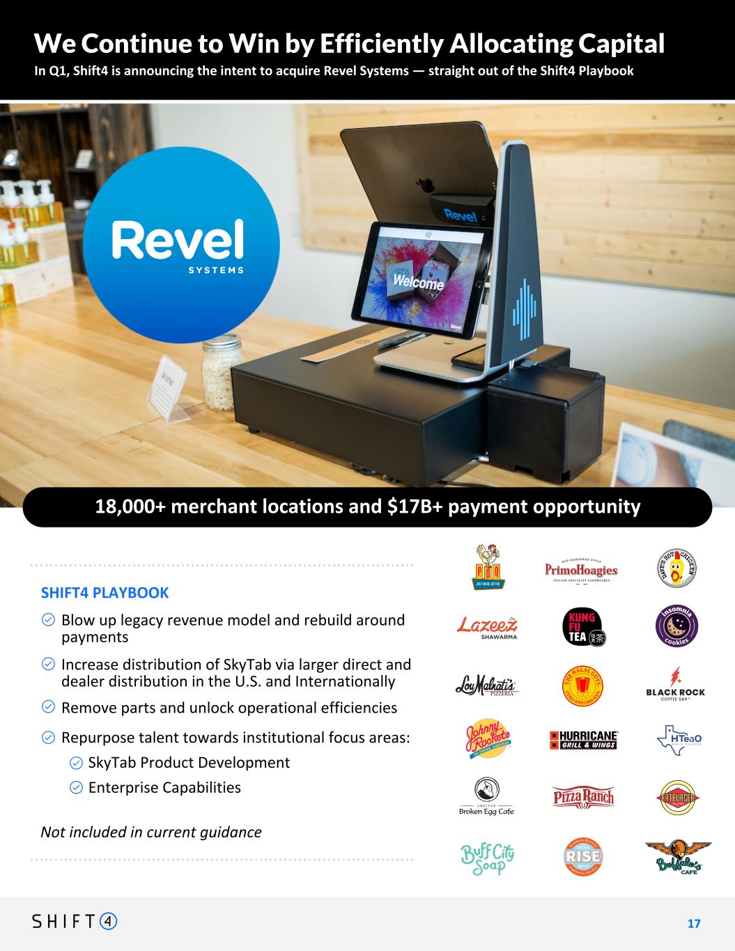 We Continue to Win by Efficiently Allocating Capital In Q1, Shift4 is announcing the intent to acquire Revel Systems — straight out of the Shift4 Playbook 1 7 17 2024 GOAL & BEYOND Blow up legacy revenue model and rebuild around payments Increase distribution of SkyTab via larger direct and dealer distribution in the U.S. and Internationally Remove parts and unlock operational efficiencies Repurpose talent towards institutional focus areas: SkyTab Product Development Enterprise Capabilities SHIFT4 PLAYBOOK 18,000+ merchant locations and $17B+ payment opportunity Not included in current guidance