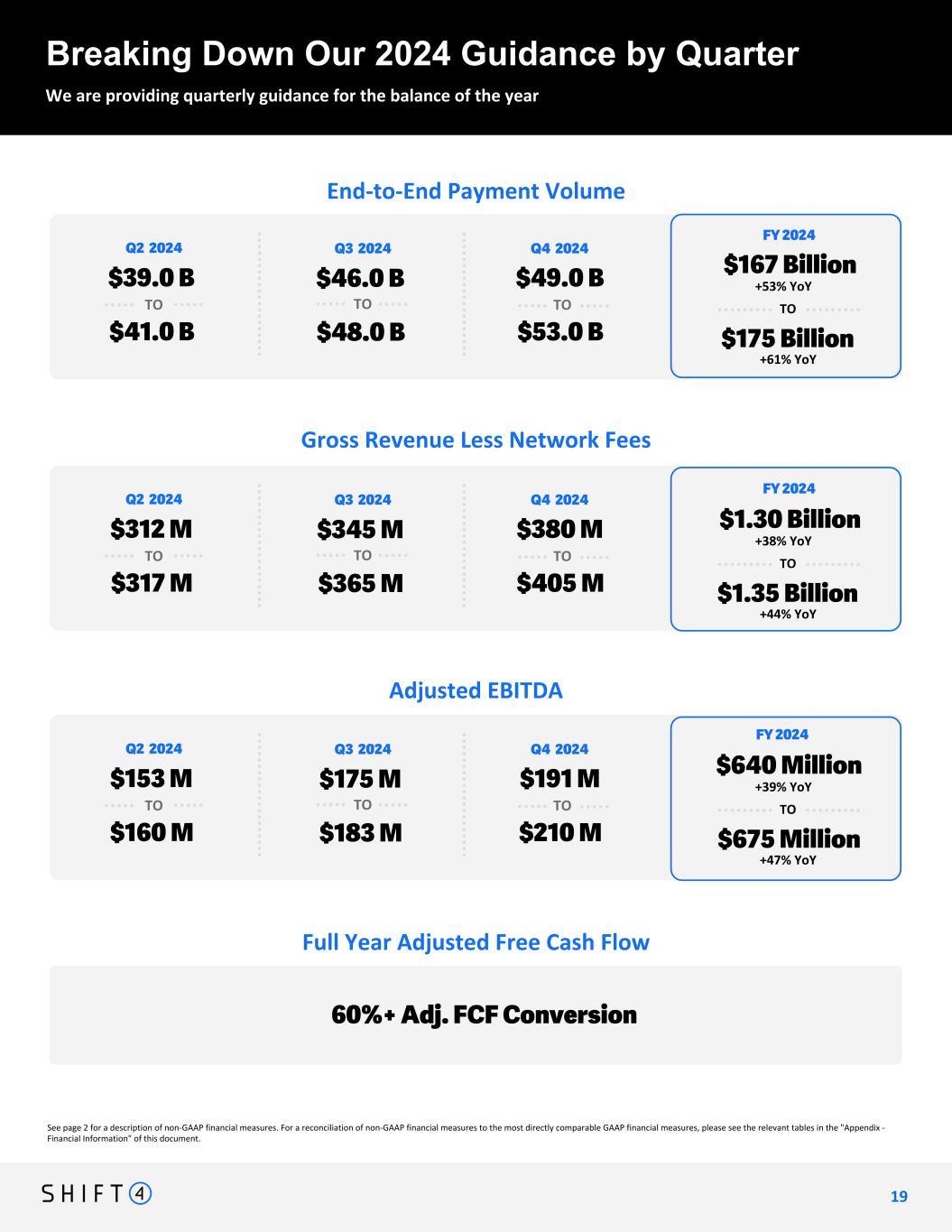 See page 2 for a description of non-GAAP financial measures. For a reconciliation of non-GAAP financial measures to the most directly comparable GAAP financial measures, please see the relevant tables in the "Appendix - Financial Information" of this document. Breaking Down Our 2024 Guidance by Quarter We are providing quarterly guidance for the balance of the year 1 9 19 Intended Message: Adjusted for contribution from Finaro/Appetize, we're looking at 31% YoY GRLNF growth in Q4 Full Year Adjusted Free Cash Flow 60%+ Adj. FCF Conversion End-to-End Payment Volume $39.0 B $41.0 B TO Q2 2024 $46.0 B $48.0 B TO Q3 2024 $49.0 B $53.0 B TO Q4 2024 $167 Billion $175 Billion TO FY 2024 +53% YoY +61% YoY Gross Revenue Less Network Fees $1.30 Billion $1.35 Billion TO FY 2024 +38% YoY +44% YoY Adjusted EBITDA $640 Million $675 Million TO FY 2024 +39% YoY +47% YoY $312 M $317 M TO Q2 2024 $345 M $365 M TO Q3 2024 $380 M $405 M TO Q4 2024 $153 M $160 M TO Q2 2024 $175 M $183 M TO Q3 2024 $191 M $210 M TO Q4 2024 format fix + change to #s from Nancy