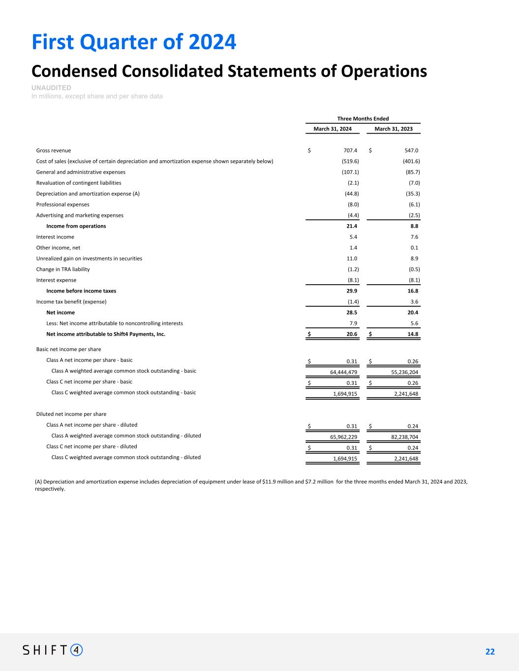 First Quarter of 2024 Condensed Consolidated Statements of Operations UNAUDITED In millions, except share and per share data Three Months Ended March 31, 2024 March 31, 2023 Gross revenue $ 707.4 $ 547.0 Cost of sales (exclusive of certain depreciation and amortization expense shown separately below) (519.6) (401.6) General and administrative expenses (107.1) (85.7) Revaluation of contingent liabilities (2.1) (7.0) Depreciation and amortization expense (A) (44.8) (35.3) Professional expenses (8.0) (6.1) Advertising and marketing expenses (4.4) (2.5) Income from operations 21.4 8.8 Interest income 5.4 7.6 Other income, net 1.4 0.1 Unrealized gain on investments in securities 11.0 8.9 Change in TRA liability (1.2) (0.5) Interest expense (8.1) (8.1) Income before income taxes 29.9 16.8 Income tax benefit (expense) (1.4) 3.6 Net income 28.5 20.4 Less: Net income attributable to noncontrolling interests 7.9 5.6 Net income attributable to Shift4 Payments, Inc. $ 20.6 $ 14.8 Basic net income per share Class A net income per share - basic $ 0.31 $ 0.26 Class A weighted average common stock outstanding - basic 64,444,479 55,236,204 Class C net income per share - basic $ 0.31 $ 0.26 Class C weighted average common stock outstanding - basic 1,694,915 2,241,648 Diluted net income per share Class A net income per share - diluted $ 0.31 $ 0.24 Class A weighted average common stock outstanding - diluted 65,962,229 82,238,704 Class C net income per share - diluted $ 0.31 $ 0.24 Class C weighted average common stock outstanding - diluted 1,694,915 2,241,648 (A) Depreciation and amortization expense includes depreciation of equipment under lease of $11.9 million and $7.2 million for the three months ended March 31, 2024 and 2023, respectively. 2 2 22