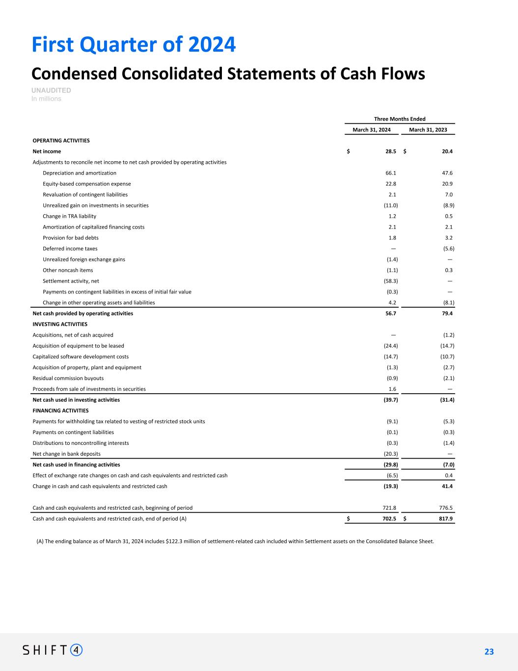 First Quarter of 2024 Condensed Consolidated Statements of Cash Flows UNAUDITED In millions Three Months Ended March 31, 2024 March 31, 2023 OPERATING ACTIVITIES Net income $ 28.5 $ 20.4 Adjustments to reconcile net income to net cash provided by operating activities Depreciation and amortization 66.1 47.6 Equity-based compensation expense 22.8 20.9 Revaluation of contingent liabilities 2.1 7.0 Unrealized gain on investments in securities (11.0) (8.9) Change in TRA liability 1.2 0.5 Amortization of capitalized financing costs 2.1 2.1 Provision for bad debts 1.8 3.2 Deferred income taxes — (5.6) Unrealized foreign exchange gains (1.4) — Other noncash items (1.1) 0.3 Settlement activity, net (58.3) — Payments on contingent liabilities in excess of initial fair value (0.3) — Change in other operating assets and liabilities 4.2 (8.1) Net cash provided by operating activities 56.7 79.4 INVESTING ACTIVITIES Acquisitions, net of cash acquired — (1.2) Acquisition of equipment to be leased (24.4) (14.7) Capitalized software development costs (14.7) (10.7) Acquisition of property, plant and equipment (1.3) (2.7) Residual commission buyouts (0.9) (2.1) Proceeds from sale of investments in securities 1.6 — Net cash used in investing activities (39.7) (31.4) FINANCING ACTIVITIES Payments for withholding tax related to vesting of restricted stock units (9.1) (5.3) Payments on contingent liabilities (0.1) (0.3) Distributions to noncontrolling interests (0.3) (1.4) Net change in bank deposits (20.3) — Net cash used in financing activities (29.8) (7.0) Effect of exchange rate changes on cash and cash equivalents and restricted cash (6.5) 0.4 Change in cash and cash equivalents and restricted cash (19.3) 41.4 Cash and cash equivalents and restricted cash, beginning of period 721.8 776.5 Cash and cash equivalents and restricted cash, end of period (A) $ 702.5 $ 817.9 2 3 23 (A) The ending balance as of March 31, 2024 includes $122.3 million of settlement-related cash included within Settlement assets on the Consolidated Balance Sheet.
