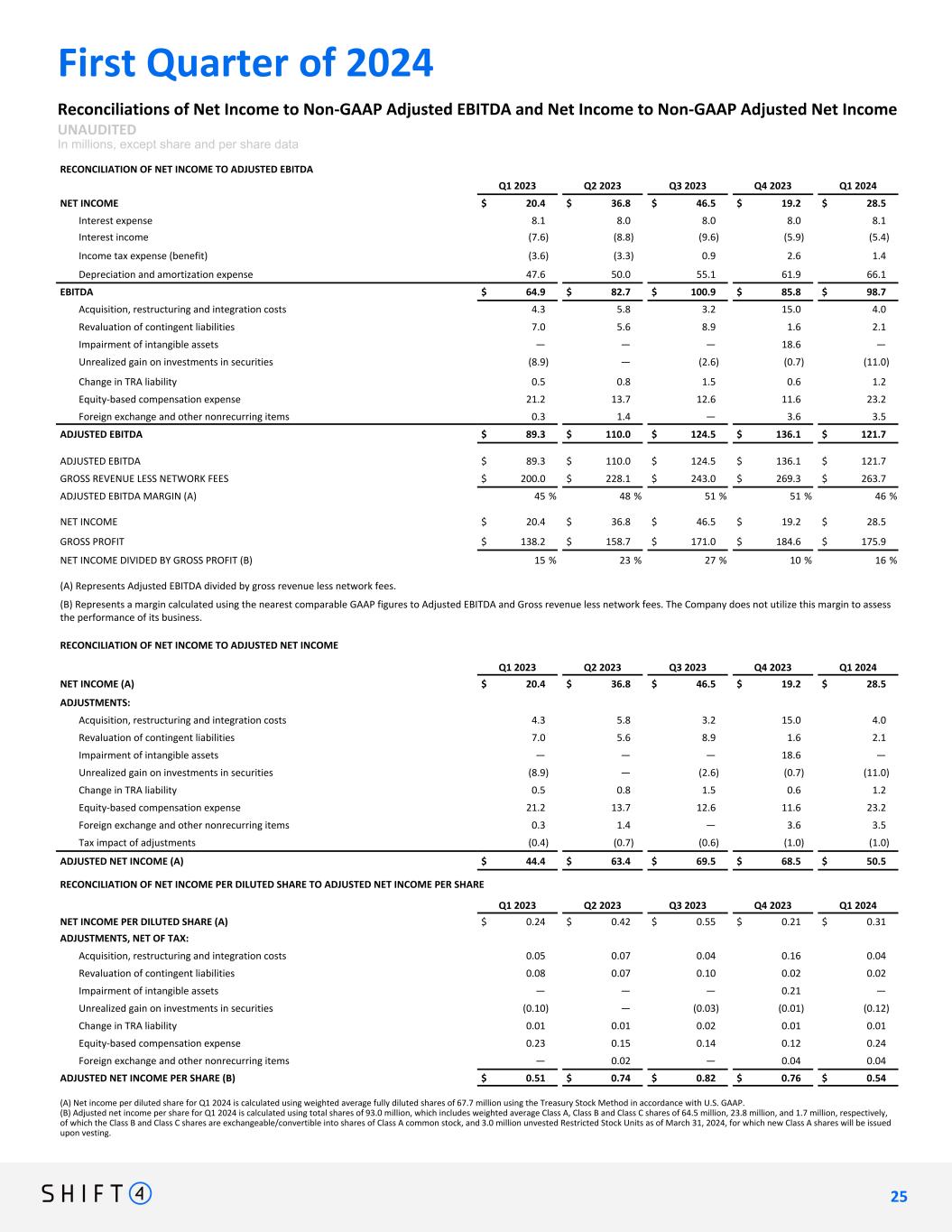 First Quarter of 2024 Reconciliations of Net Income to Non-GAAP Adjusted EBITDA and Net Income to Non-GAAP Adjusted Net Income UNAUDITED In millions, except share and per share data RECONCILIATION OF NET INCOME TO ADJUSTED EBITDA Q1 2023 Q2 2023 Q3 2023 Q4 2023 Q1 2024 NET INCOME $ 20.4 $ 36.8 $ 46.5 $ 19.2 $ 28.5 Interest expense 8.1 8.0 8.0 8.0 8.1 Interest income (7.6) (8.8) (9.6) (5.9) (5.4) Income tax expense (benefit) (3.6) (3.3) 0.9 2.6 1.4 Depreciation and amortization expense 47.6 50.0 55.1 61.9 66.1 EBITDA $ 64.9 $ 82.7 $ 100.9 $ 85.8 $ 98.7 Acquisition, restructuring and integration costs 4.3 5.8 3.2 15.0 4.0 Revaluation of contingent liabilities 7.0 5.6 8.9 1.6 2.1 Impairment of intangible assets — — — 18.6 — Unrealized gain on investments in securities (8.9) — (2.6) (0.7) (11.0) Change in TRA liability 0.5 0.8 1.5 0.6 1.2 Equity-based compensation expense 21.2 13.7 12.6 11.6 23.2 Foreign exchange and other nonrecurring items 0.3 1.4 — 3.6 3.5 ADJUSTED EBITDA $ 89.3 $ 110.0 $ 124.5 $ 136.1 $ 121.7 ADJUSTED EBITDA $ 89.3 $ 110.0 $ 124.5 $ 136.1 $ 121.7 GROSS REVENUE LESS NETWORK FEES $ 200.0 $ 228.1 $ 243.0 $ 269.3 $ 263.7 ADJUSTED EBITDA MARGIN (A) 45 % 48 % 51 % 51 % 46 % NET INCOME $ 20.4 $ 36.8 $ 46.5 $ 19.2 $ 28.5 GROSS PROFIT $ 138.2 $ 158.7 $ 171.0 $ 184.6 $ 175.9 NET INCOME DIVIDED BY GROSS PROFIT (B) 15 % 23 % 27 % 10 % 16 % (A) Represents Adjusted EBITDA divided by gross revenue less network fees. (B) Represents a margin calculated using the nearest comparable GAAP figures to Adjusted EBITDA and Gross revenue less network fees. The Company does not utilize this margin to assess the performance of its business. RECONCILIATION OF NET INCOME TO ADJUSTED NET INCOME Q1 2023 Q2 2023 Q3 2023 Q4 2023 Q1 2024 NET INCOME (A) $ 20.4 $ 36.8 $ 46.5 $ 19.2 $ 28.5 ADJUSTMENTS: Acquisition, restructuring and integration costs 4.3 5.8 3.2 15.0 4.0 Revaluation of contingent liabilities 7.0 5.6 8.9 1.6 2.1 Impairment of intangible assets — — — 18.6 — Unrealized gain on investments in securities (8.9) — (2.6) (0.7) (11.0) Change in TRA liability 0.5 0.8 1.5 0.6 1.2 Equity-based compensation expense 21.2 13.7 12.6 11.6 23.2 Foreign exchange and other nonrecurring items 0.3 1.4 — 3.6 3.5 Tax impact of adjustments (0.4) (0.7) (0.6) (1.0) (1.0) ADJUSTED NET INCOME (A) $ 44.4 $ 63.4 $ 69.5 $ 68.5 $ 50.5 RECONCILIATION OF NET INCOME PER DILUTED SHARE TO ADJUSTED NET INCOME PER SHARE Q1 2023 Q2 2023 Q3 2023 Q4 2023 Q1 2024 NET INCOME PER DILUTED SHARE (A) $ 0.24 $ 0.42 $ 0.55 $ 0.21 $ 0.31 ADJUSTMENTS, NET OF TAX: Acquisition, restructuring and integration costs 0.05 0.07 0.04 0.16 0.04 Revaluation of contingent liabilities 0.08 0.07 0.10 0.02 0.02 Impairment of intangible assets — — — 0.21 — Unrealized gain on investments in securities (0.10) — (0.03) (0.01) (0.12) Change in TRA liability 0.01 0.01 0.02 0.01 0.01 Equity-based compensation expense 0.23 0.15 0.14 0.12 0.24 Foreign exchange and other nonrecurring items — 0.02 — 0.04 0.04 ADJUSTED NET INCOME PER SHARE (B) $ 0.51 $ 0.74 $ 0.82 $ 0.76 $ 0.54 (A) Net income per diluted share for Q1 2024 is calculated using weighted average fully diluted shares of 67.7 million using the Treasury Stock Method in accordance with U.S. GAAP. (B) Adjusted net income per share for Q1 2024 is calculated using total shares of 93.0 million, which includes weighted average Class A, Class B and Class C shares of 64.5 million, 23.8 million, and 1.7 million, respectively, of which the Class B and Class C shares are exchangeable/convertible into shares of Class A common stock, and 3.0 million unvested Restricted Stock Units as of March 31, 2024, for which new Class A shares will be issued upon vesting. 2 5 25