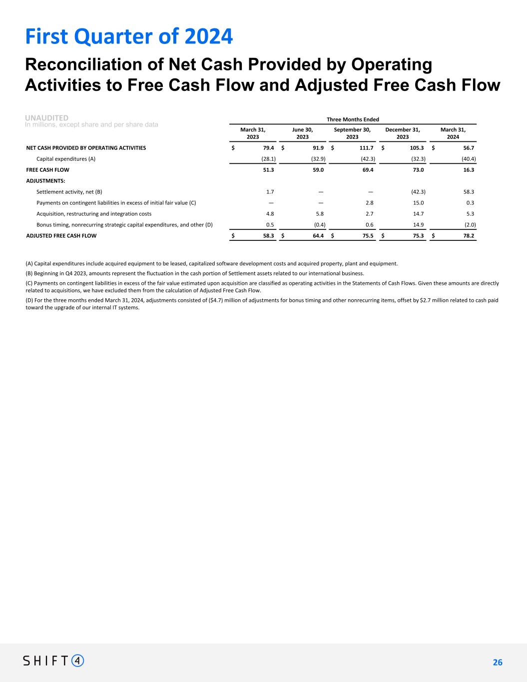 Three Months Ended March 31, 2023 June 30, 2023 September 30, 2023 December 31, 2023 March 31, 2024 NET CASH PROVIDED BY OPERATING ACTIVITIES $ 79.4 $ 91.9 $ 111.7 $ 105.3 $ 56.7 Capital expenditures (A) (28.1) (32.9) (42.3) (32.3) (40.4) FREE CASH FLOW 51.3 59.0 69.4 73.0 16.3 ADJUSTMENTS: Settlement activity, net (B) 1.7 — — (42.3) 58.3 Payments on contingent liabilities in excess of initial fair value (C) — — 2.8 15.0 0.3 Acquisition, restructuring and integration costs 4.8 5.8 2.7 14.7 5.3 Bonus timing, nonrecurring strategic capital expenditures, and other (D) 0.5 (0.4) 0.6 14.9 (2.0) ADJUSTED FREE CASH FLOW $ 58.3 $ 64.4 $ 75.5 $ 75.3 $ 78.2 Reconciliation of Net Cash Provided by Operating Activities to Free Cash Flow and Adjusted Free Cash Flow UNAUDITED In millions, except share and per share data First Quarter of 2024 (A) Capital expenditures include acquired equipment to be leased, capitalized software development costs and acquired property, plant and equipment. (B) Beginning in Q4 2023, amounts represent the fluctuation in the cash portion of Settlement assets related to our international business. (C) Payments on contingent liabilities in excess of the fair value estimated upon acquisition are classified as operating activities in the Statements of Cash Flows. Given these amounts are directly related to acquisitions, we have excluded them from the calculation of Adjusted Free Cash Flow. (D) For the three months ended March 31, 2024, adjustments consisted of ($4.7) million of adjustments for bonus timing and other nonrecurring items, offset by $2.7 million related to cash paid toward the upgrade of our internal IT systems. 2 6 26