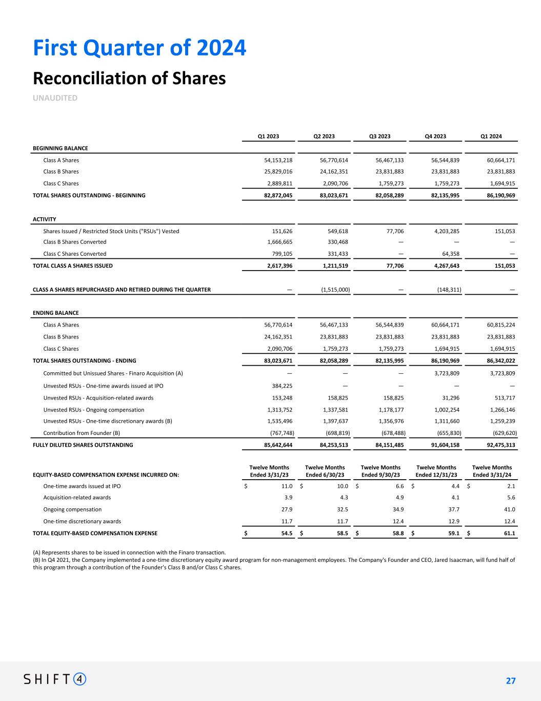 First Quarter of 2024 Reconciliation of Shares UNAUDITED Q1 2023 Q2 2023 Q3 2023 Q4 2023 Q1 2024 BEGINNING BALANCE Class A Shares 54,153,218 56,770,614 56,467,133 56,544,839 60,664,171 Class B Shares 25,829,016 24,162,351 23,831,883 23,831,883 23,831,883 Class C Shares 2,889,811 2,090,706 1,759,273 1,759,273 1,694,915 TOTAL SHARES OUTSTANDING - BEGINNING 82,872,045 83,023,671 82,058,289 82,135,995 86,190,969 ACTIVITY Shares Issued / Restricted Stock Units ("RSUs") Vested 151,626 549,618 77,706 4,203,285 151,053 Class B Shares Converted 1,666,665 330,468 — — — Class C Shares Converted 799,105 331,433 — 64,358 — TOTAL CLASS A SHARES ISSUED 2,617,396 1,211,519 77,706 4,267,643 151,053 CLASS A SHARES REPURCHASED AND RETIRED DURING THE QUARTER — (1,515,000) — (148,311) — ENDING BALANCE Class A Shares 56,770,614 56,467,133 56,544,839 60,664,171 60,815,224 Class B Shares 24,162,351 23,831,883 23,831,883 23,831,883 23,831,883 Class C Shares 2,090,706 1,759,273 1,759,273 1,694,915 1,694,915 TOTAL SHARES OUTSTANDING - ENDING 83,023,671 82,058,289 82,135,995 86,190,969 86,342,022 Committed but Unissued Shares - Finaro Acquisition (A) — — — 3,723,809 3,723,809 Unvested RSUs - One-time awards issued at IPO 384,225 — — — — Unvested RSUs - Acquisition-related awards 153,248 158,825 158,825 31,296 513,717 Unvested RSUs - Ongoing compensation 1,313,752 1,337,581 1,178,177 1,002,254 1,266,146 Unvested RSUs - One-time discretionary awards (B) 1,535,496 1,397,637 1,356,976 1,311,660 1,259,239 Contribution from Founder (B) (767,748) (698,819) (678,488) (655,830) (629,620) FULLY DILUTED SHARES OUTSTANDING 85,642,644 84,253,513 84,151,485 91,604,158 92,475,313 EQUITY-BASED COMPENSATION EXPENSE INCURRED ON: Twelve Months Ended 3/31/23 Twelve Months Ended 6/30/23 Twelve Months Ended 9/30/23 Twelve Months Ended 12/31/23 Twelve Months Ended 3/31/24 One-time awards issued at IPO $ 11.0 $ 10.0 $ 6.6 $ 4.4 $ 2.1 Acquisition-related awards 3.9 4.3 4.9 4.1 5.6 Ongoing compensation 27.9 32.5 34.9 37.7 41.0 One-time discretionary awards 11.7 11.7 12.4 12.9 12.4 TOTAL EQUITY-BASED COMPENSATION EXPENSE $ 54.5 $ 58.5 $ 58.8 $ 59.1 $ 61.1 (A) Represents shares to be issued in connection with the Finaro transaction. (B) In Q4 2021, the Company implemented a one-time discretionary equity award program for non-management employees. The Company's Founder and CEO, Jared Isaacman, will fund half of this program through a contribution of the Founder's Class B and/or Class C shares. 2 7 27