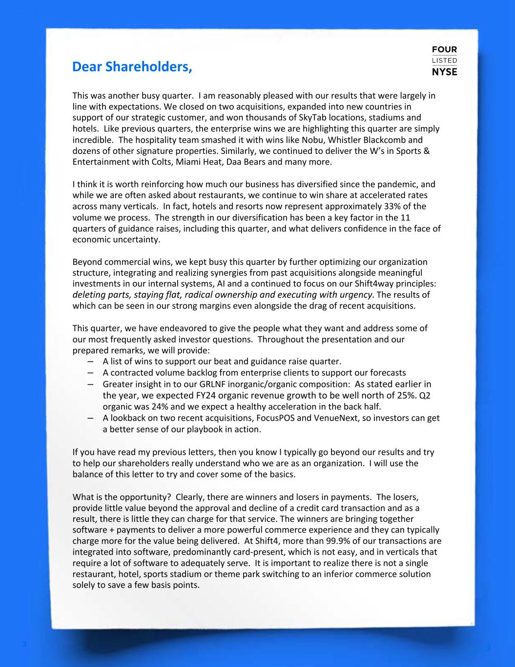 Dear Shareholders, 3 3 Jared Isaacman CEO jared@shift4.com circulated via email ongoing changes being circulated via email from: word doc v13 This was another busy quarter. I am reasonably pleased with our results that were largely in line with expectations. We closed on two acquisitions, expanded into new countries in support of our strategic customer, and won thousands of SkyTab locations, stadiums and hotels. Like previous quarters, the enterprise wins we are highlighting this quarter are simply incredible. The hospitality team smashed it with wins like Nobu, Whistler Blackcomb and dozens of other signature properties. Similarly, we continued to deliver the W’s in Sports & Entertainment with Colts, Miami Heat, Daa Bears and many more. I think it is worth reinforcing how much our business has diversified since the pandemic, and while we are often asked about restaurants, we continue to win share at accelerated rates across many verticals. In fact, hotels and resorts now represent approximately 33% of the volume we process. The strength in our diversification has been a key factor in the 11 quarters of guidance raises, including this quarter, and what delivers confidence in the face of economic uncertainty. Beyond commercial wins, we kept busy this quarter by further optimizing our organization structure, integrating and realizing synergies from past acquisitions alongside meaningful investments in our internal systems, AI and a continued to focus on our Shift4way principles: deleting parts, staying flat, radical ownership and executing with urgency. The results of which can be seen in our strong margins even alongside the drag of recent acquisitions. This quarter, we have endeavored to give the people what they want and address some of our most frequently asked investor questions. Throughout the presentation and our prepared remarks, we will provide: – A list of wins to support our beat and guidance raise quarter. – A contracted volume backlog from enterprise clients to support our forecasts – Greater insight in to our GRLNF inorganic/organic composition: As stated earlier in the year, we expected FY24 organic revenue growth to be well north of 25%. Q2 organic was 24% and we expect a healthy acceleration in the back half. – A lookback on two recent acquisitions, FocusPOS and VenueNext, so investors can get a better sense of our playbook in action. If you have read my previous letters, then you know I typically go beyond our results and try to help our shareholders really understand who we are as an organization. I will use the balance of this letter to try and cover some of the basics. What is the opportunity? Clearly, there are winners and losers in payments. The losers, provide little value beyond the approval and decline of a credit card transaction and as a result, there is little they can charge for that service. The winners are bringing together software + payments to deliver a more powerful commerce experience and they can typically charge more for the value being delivered. At Shift4, more than 99.9% of our transactions are integrated into software, predominantly card-present, which is not easy, and in verticals that require a lot of software to adequately serve. It is important to realize there is not a single restaurant, hotel, sports stadium or theme park switching to an inferior commerce solution solely to save a few basis points.