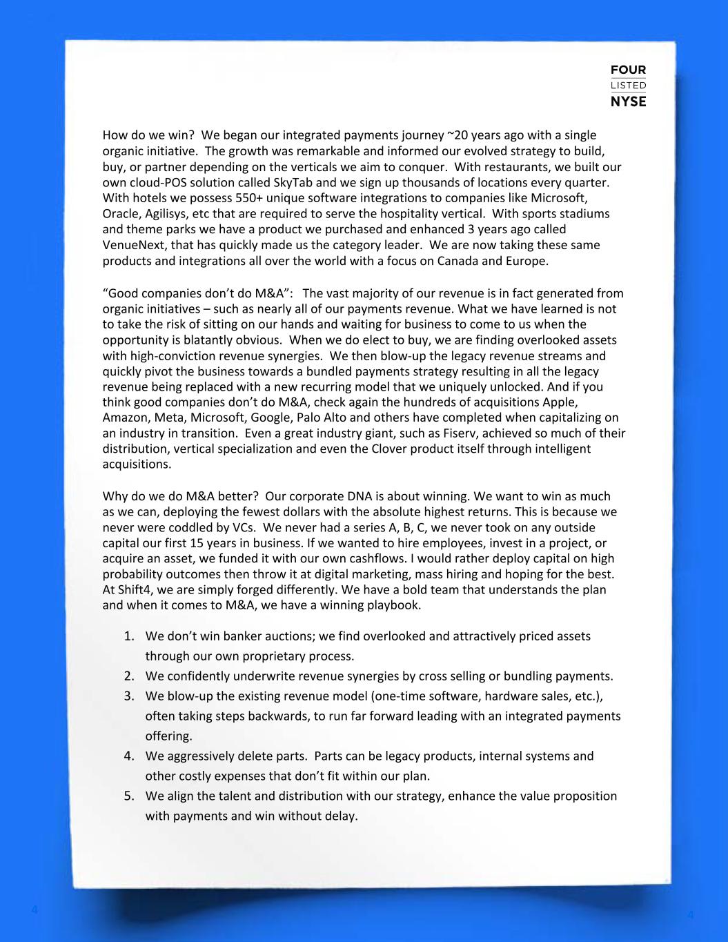 4 4 Jared Isaacman CEO jared@shift4.com circulated via email ongoing changes being circulated via email from: word doc v13 How do we win? We began our integrated payments journey ~20 years ago with a single organic initiative. The growth was remarkable and informed our evolved strategy to build, buy, or partner depending on the verticals we aim to conquer. With restaurants, we built our own cloud-POS solution called SkyTab and we sign up thousands of locations every quarter. With hotels we possess 550+ unique software integrations to companies like Microsoft, Oracle, Agilisys, etc that are required to serve the hospitality vertical. With sports stadiums and theme parks we have a product we purchased and enhanced 3 years ago called VenueNext, that has quickly made us the category leader. We are now taking these same products and integrations all over the world with a focus on Canada and Europe. “Good companies don’t do M&A”: The vast majority of our revenue is in fact generated from organic initiatives – such as nearly all of our payments revenue. What we have learned is not to take the risk of sitting on our hands and waiting for business to come to us when the opportunity is blatantly obvious. When we do elect to buy, we are finding overlooked assets with high-conviction revenue synergies. We then blow-up the legacy revenue streams and quickly pivot the business towards a bundled payments strategy resulting in all the legacy revenue being replaced with a new recurring model that we uniquely unlocked. And if you think good companies don’t do M&A, check again the hundreds of acquisitions Apple, Amazon, Meta, Microsoft, Google, Palo Alto and others have completed when capitalizing on an industry in transition. Even a great industry giant, such as Fiserv, achieved so much of their distribution, vertical specialization and even the Clover product itself through intelligent acquisitions. Why do we do M&A better? Our corporate DNA is about winning. We want to win as much as we can, deploying the fewest dollars with the absolute highest returns. This is because we never were coddled by VCs. We never had a series A, B, C, we never took on any outside capital our first 15 years in business. If we wanted to hire employees, invest in a project, or acquire an asset, we funded it with our own cashflows. I would rather deploy capital on high probability outcomes then throw it at digital marketing, mass hiring and hoping for the best. At Shift4, we are simply forged differently. We have a bold team that understands the plan and when it comes to M&A, we have a winning playbook. 1. We don’t win banker auctions; we find overlooked and attractively priced assets through our own proprietary process. 2. We confidently underwrite revenue synergies by cross selling or bundling payments. 3. We blow-up the existing revenue model (one-time software, hardware sales, etc.), often taking steps backwards, to run far forward leading with an integrated payments offering. 4. We aggressively delete parts. Parts can be legacy products, internal systems and other costly expenses that don’t fit within our plan. 5. We align the talent and distribution with our strategy, enhance the value proposition with payments and win without delay.