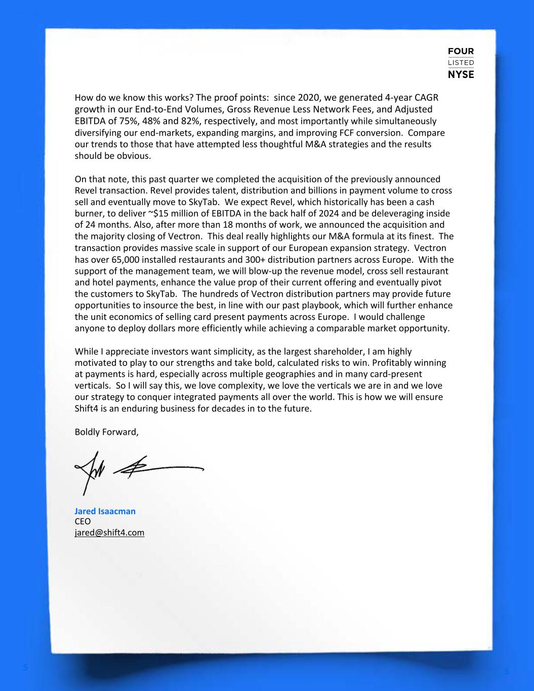 How do we know this works? The proof points: since 2020, we generated 4-year CAGR growth in our End-to-End Volumes, Gross Revenue Less Network Fees, and Adjusted EBITDA of 75%, 48% and 82%, respectively, and most importantly while simultaneously diversifying our end-markets, expanding margins, and improving FCF conversion. Compare our trends to those that have attempted less thoughtful M&A strategies and the results should be obvious. On that note, this past quarter we completed the acquisition of the previously announced Revel transaction. Revel provides talent, distribution and billions in payment volume to cross sell and eventually move to SkyTab. We expect Revel, which historically has been a cash burner, to deliver ~$15 million of EBITDA in the back half of 2024 and be deleveraging inside of 24 months. Also, after more than 18 months of work, we announced the acquisition and the majority closing of Vectron. This deal really highlights our M&A formula at its finest. The transaction provides massive scale in support of our European expansion strategy. Vectron has over 65,000 installed restaurants and 300+ distribution partners across Europe. With the support of the management team, we will blow-up the revenue model, cross sell restaurant and hotel payments, enhance the value prop of their current offering and eventually pivot the customers to SkyTab. The hundreds of Vectron distribution partners may provide future opportunities to insource the best, in line with our past playbook, which will further enhance the unit economics of selling card present payments across Europe. I would challenge anyone to deploy dollars more efficiently while achieving a comparable market opportunity. While I appreciate investors want simplicity, as the largest shareholder, I am highly motivated to play to our strengths and take bold, calculated risks to win. Profitably winning at payments is hard, especially across multiple geographies and in many card-present verticals. So I will say this, we love complexity, we love the verticals we are in and we love our strategy to conquer integrated payments all over the world. This is how we will ensure Shift4 is an enduring business for decades in to the future. Boldly Forward, Jared Isaacman CEO jared@shift4.com 5 5 ongoing changes being circulated via email from: word doc v13