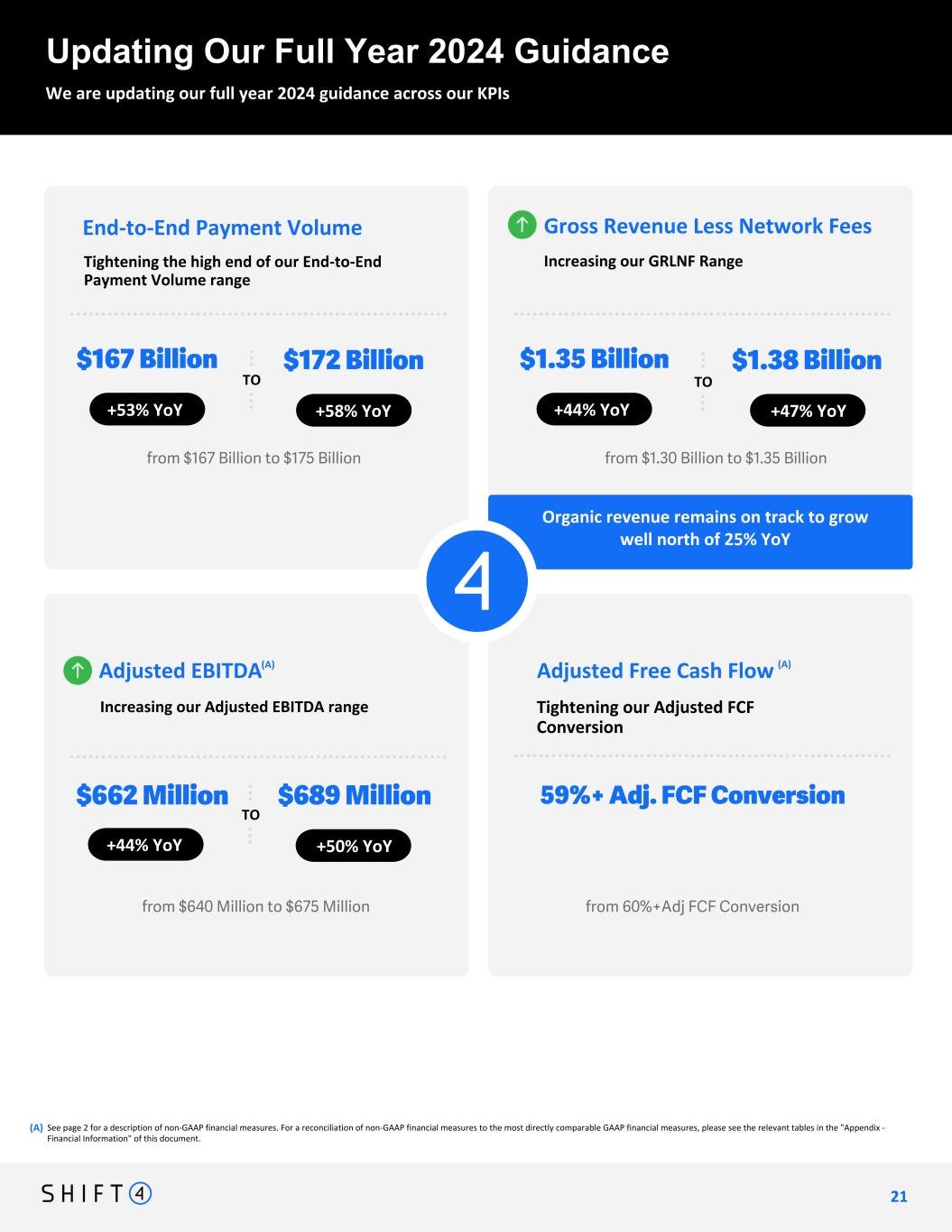 Non-GAAP Financial Measures and Key Performance Indicators Forward-Looking Statements We use supplemental measures of our performance which are derived from our consolidated financial information but which are not presented in our consolidated financial statements prepared in accordance with U.S. generally accepted accounting principles ("GAAP"). These non-GAAP financial measures include: gross revenue less network fees, which includes interchange and adjustment fees; adjusted net income; adjusted net income per share; free cash flow; Adjusted Free Cash Flow; earnings before interest expense, interest income, income taxes, depreciation, and amortization (“EBITDA”); Adjusted EBITDA; Adjusted EBITDA conversion rate; and Adjusted EBITDA margin. Gross revenue less network fees represents a key performance metric that management uses to measure changes in the mix and value derived from our customer base as we continue to execute our strategy to expand our reach to serve larger, complex merchants. Adjusted net income represents net income adjusted for certain non-cash and other nonrecurring items that management believes are not indicative of ongoing operations, such as acquisition, restructuring and integration costs, revaluation of contingent liabilities, impairment of intangible assets, unrealized gain (loss) on investments in securities, change in TRA liability, equity-based compensation expense, and foreign exchange and other nonrecurring items. Adjusted EBITDA is the primary financial performance measure used by management to evaluate its business and monitor results of operations. Adjusted EBITDA represents EBITDA further adjusted for certain non- cash and other nonrecurring items that management believes are not indicative of ongoing operations. These adjustments include acquisition, restructuring and integration costs, revaluation of contingent liabilities, impairment of intangible assets, unrealized gain (loss) on investments in securities, changes in TRA liability, equity-based compensation expense, and foreign exchange and other nonrecurring items. Free cash flow represents net cash provided by operating activities adjusted for non-discretionary capital expenditures. Adjusted EBITDA Margin represents Adjusted EBITDA divided by gross revenue less network fees. Free cash flow represents net cash provided by operating activities adjusted for certain capital expenditures. Adjusted Free Cash Flow represents free cash flow further adjusted for certain transactions that are not indicative of future operating cash flows, including settlement activity (which represents the change in our settlement assets and liabilities), acquisition, restructuring and integration costs, the impact of timing of annual performance bonuses, other nonrecurring expenses, and nonrecurring strategic capital expenditures that are not indicative of ongoing activities. We believe Adjusted Free Cash Flow is useful to measure the funds generated in a given period that are available to invest in the business, to repurchase stock and to make strategic decisions. The Adjusted EBITDA conversion rate is calculated as Adjusted Free Cash Flow divided by Adjusted EBITDA. We use non-GAAP financial measures to supplement financial information presented on a GAAP basis. We believe that excluding certain items from our GAAP results allows management to better understand our consolidated financial performance and, in the case of Adjusted Free Cash Flow, our liquidity, from period to period and better project our future consolidated financial performance as forecasts are developed at a level of detail different from that used to prepare GAAP-based financial measures. Moreover, we believe these non-GAAP financial measures provide our stakeholders with useful information to help them evaluate our operating results by facilitating an enhanced understanding of our operating performance and, in the case of Adjusted Free Cash Flow, our liquidity, and enabling them to make more meaningful period to period comparisons. There are limitations to the use of the non-GAAP financial measures presented in this letter. Our non-GAAP financial measures may not be comparable to similarly titled measures of other companies. Other companies, including companies in our industry, may calculate non-GAAP financial measures differently than we do, limiting the usefulness of those measures for comparative purposes. We have based these forward-looking statements largely on our current expectations and projections about future events and financial trends that we believe may affect our business, financial condition and results of operations. These forward-looking statements speak only as of the date of this letter. These statements are neither promises nor guarantees, but involve known and unknown risks, uncertainties and other important factors that may cause our actual results, performance or achievements to be materially different from any future results, performance or achievements expressed or implied by the forward-looking statements, including, but not limited to, the following: the substantial and increasingly intense competition worldwide in the financial services, payments and payment technology industries; potential changes in the competitive landscape, including disintermediation from other participants in the payments chain; the effect of global economic, political and other conditions on trends in consumer, business and government spending; fluctuations in inflation; our ability to anticipate and respond to changing industry trends and the needs and preferences of our merchants and consumers; our reliance on third-party vendors to provide products and services; risks associated with acquisitions; our inability to protect our IT systems and confidential information, as well as the IT systems of third parties we rely on, from continually evolving cybersecurity risks, security breaches and/or other technological risks; compliance with governmenta