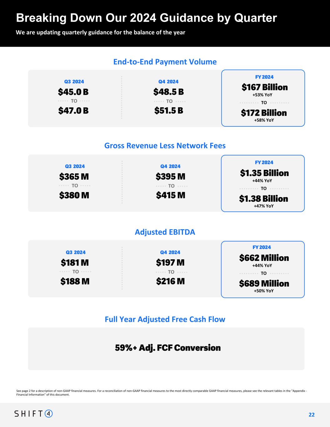 See page 2 for a description of non-GAAP financial measures. For a reconciliation of non-GAAP financial measures to the most directly comparable GAAP financial measures, please see the relevant tables in the "Appendix - Financial Information" of this document. Breaking Down Our 2024 Guidance by Quarter We are updating quarterly guidance for the balance of the year 2 2 22 Intended Message: Adjusted for contribution from Finaro/Appetize, we're looking at 31% YoY GRLNF growth in Q4 Full Year Adjusted Free Cash Flow 59%+ Adj. FCF Conversion End-to-End Payment Volume $45.0 B $47.0 B TO Q3 2024 $48.5 B $51.5 B TO Q4 2024 $167 Billion $172 Billion TO FY 2024 +53% YoY +58% YoY Gross Revenue Less Network Fees $1.35 Billion $1.38 Billion TO FY 2024 +44% YoY +47% YoY Adjusted EBITDA $662 Million $689 Million TO FY 2024 +44% YoY +50% YoY $365 M $380 M TO Q3 2024 $395 M $415 M TO Q4 2024 $181 M $188 M TO Q3 2024 $197 M $216 M TO Q4 2024 format fix + change to #s from Nancy continuing with quarterly guidance is smart. I know it was a judgement call last quarter, and just because something may have worked then doesn’t mean it will now. What it does do is ensure the analyst estimates are closer to ours, and improves our chance for a beat. I wouldn’t want to take a chance that analysts partition the second half estimates the same way we would