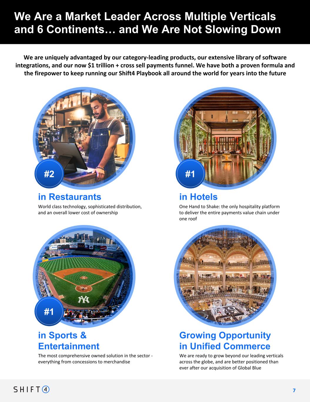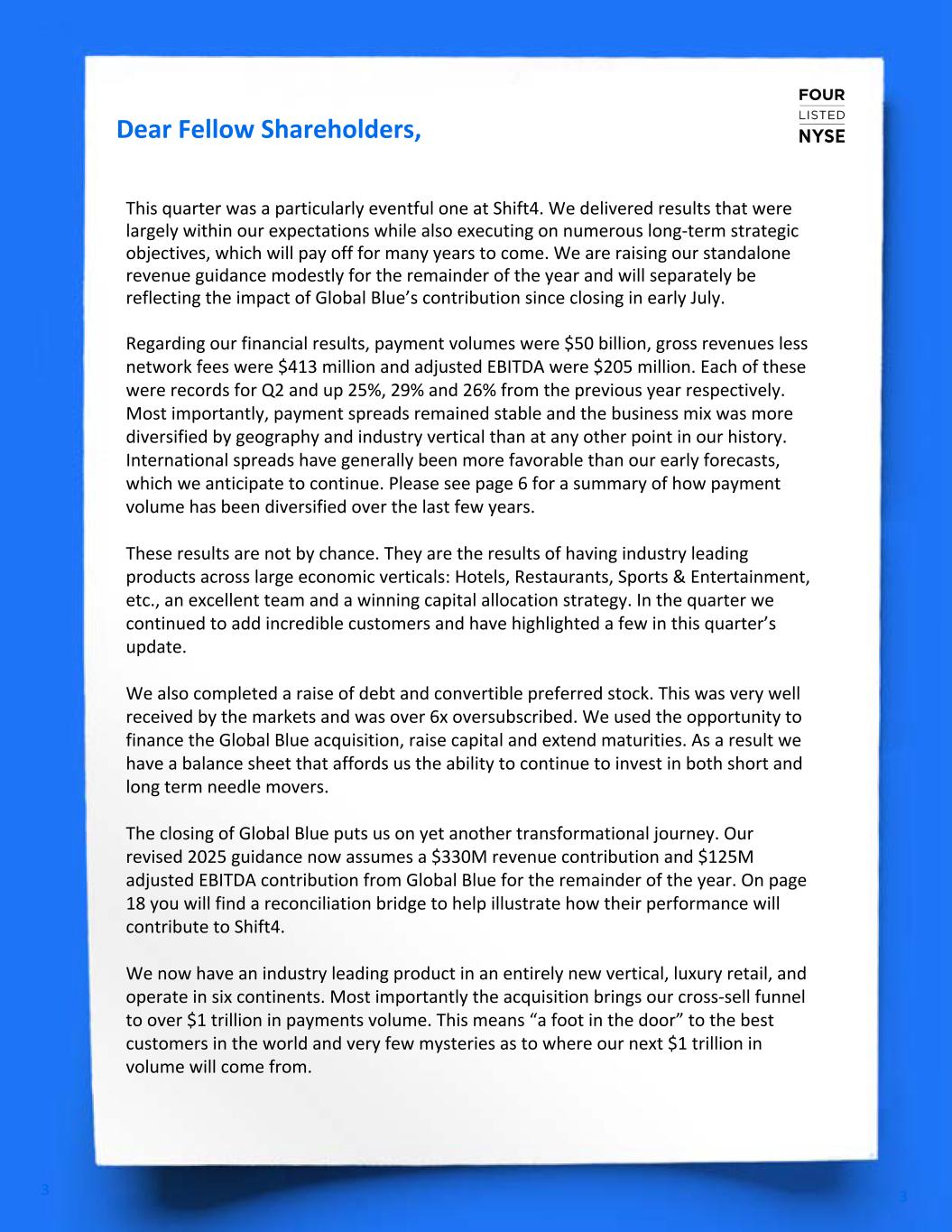 Dear Fellow Shareholders, Jared Isaacman CEO jared@shift4.com This quarter was a particularly eventful one at Shift4. We delivered results that were largely within our expectations while also executing on numerous long-term strategic objectives, which will pay off for many years to come. We are raising our standalone revenue guidance modestly for the remainder of the year and will separately be reflecting the impact of Global Blue’s contribution since closing in early July. Regarding our financial results, payment volumes were $50 billion, gross revenues less network fees were $413 million and adjusted EBITDA were $205 million. Each of these were records for Q2 and up 25%, 29% and 26% from the previous year respectively. Most importantly, payment spreads remained stable and the business mix was more diversified by geography and industry vertical than at any other point in our history. International spreads have generally been more favorable than our early forecasts, which we anticipate to continue. Please see page 6 for a summary of how payment volume has been diversified over the last few years. These results are not by chance. They are the results of having industry leading products across large economic verticals: Hotels, Restaurants, Sports & Entertainment, etc., an excellent team and a winning capital allocation strategy. In the quarter we continued to add incredible customers and have highlighted a few in this quarter’s update. We also completed a raise of debt and convertible preferred stock. This was very well received by the markets and was over 6x oversubscribed. We used the opportunity to finance the Global Blue acquisition, raise capital and extend maturities. As a result we have a balance sheet that affords us the ability to continue to invest in both short and long term needle movers. The closing of Global Blue puts us on yet another transformational journey. Our revised 2025 guidance now assumes a $330M revenue contribution and $125M adjusted EBITDA contribution from Global Blue for the remainder of the year. On page 18 you will find a reconciliation bridge to help illustrate how their performance will contribute to Shift4. We now have an industry leading product in an entirely new vertical, luxury retail, and operate in six continents. Most importantly the acquisition brings our cross-sell funnel to over $1 trillion in payments volume. This means “a foot in the door” to the best customers in the world and very few mysteries as to where our next $1 trillion in volume will come from. V4 - DRAFTS CIRCULATED VIA EMAIL (WORD DOC) 3 3