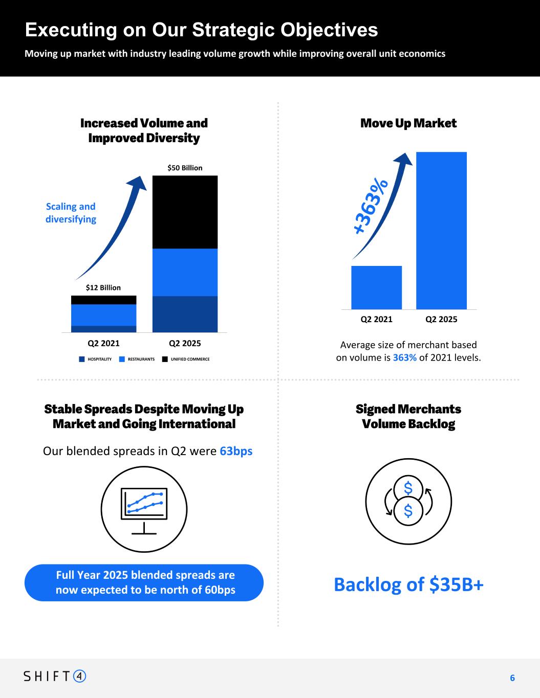 Moving up market with industry leading volume growth while improving overall unit economics Executing on Our Strategic Objectives 6 6 Increased Volume and Improved Diversity Move Up Market Average size of merchant based on volume is 363% of 2021 levels. Signed Merchants Volume Backlog Stable Spreads Despite Moving Up Market and Going International Full Year 2025 blended spreads are now expected to be north of 60bps Scaling and diversifying Backlog of $35B+ TBU "Our blended spreads in Q2 were 63bps" [graphic] Our blended spreads in Q2 were 63bps