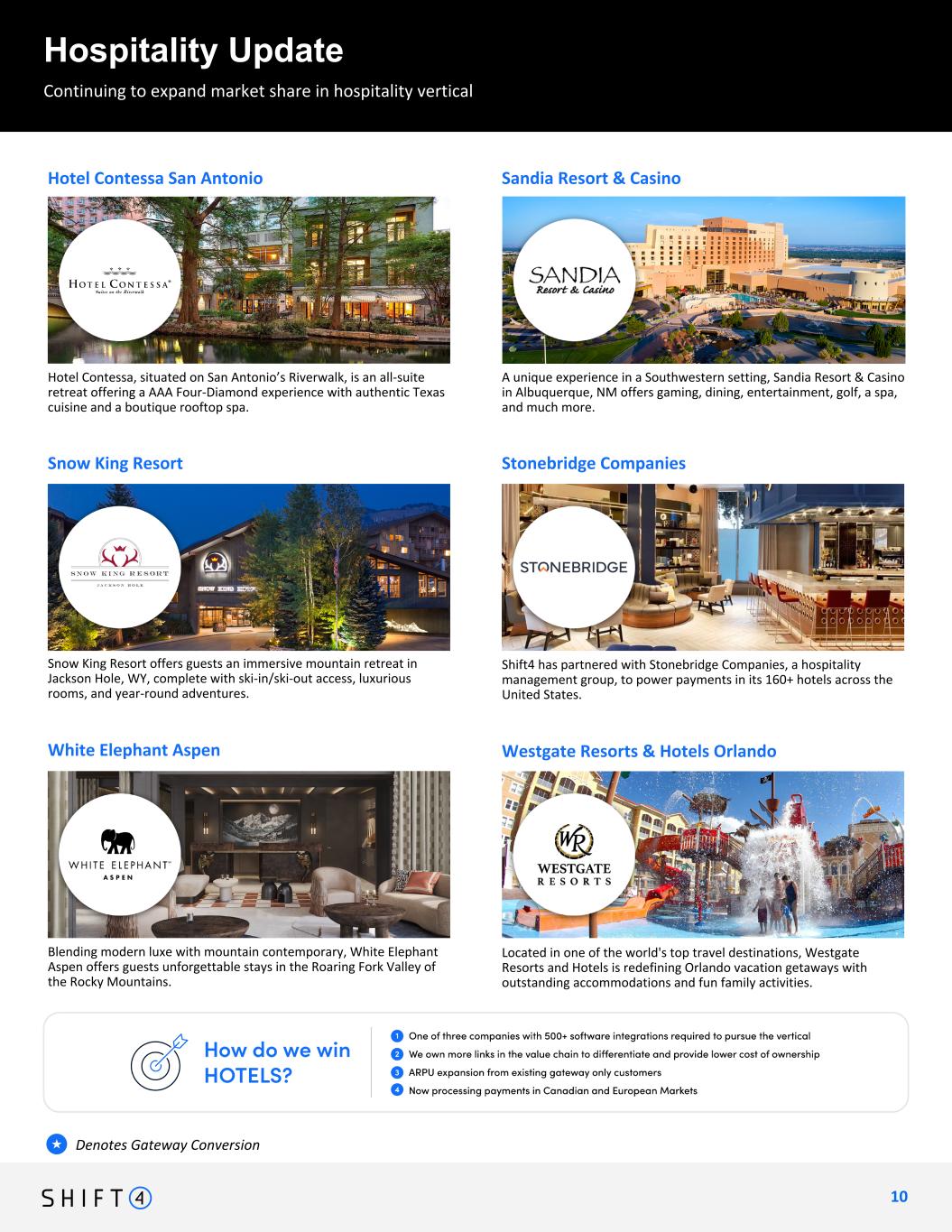 Continuing to expand market share in hospitality vertical Hospitality Update 9 9 Continuing to expand arket share in hospitality vertical Denotes Gateway Conversion★ Camelback Resort in Tannersville, PA offers the ultimate mountain getaway in the Poconos with waterparks, mountain adventures, and luxe suites and condos. Capital Vacations Located in Jacksonville, FL, Ponte Vedra Beach Resorts have offered guests elegant and refined resort, golf, tennis, spa, and recreation experiences for over 90 years. Ponte Vedra Beach Resorts Located slopeside on Blackcomb Mountain in Whistler, BC, Blackcomb Springs Suites provides a relaxing environment that fully embraces the outdoors. Camelback ResortBlackcomb Springs Suites Shift4 has partnered with Capital Vacations to power payments for over 200 travel destinations across the United States, in Mexico, and in the Caribbean. Shift4 is now processing payments for four more downtown Las Vegas resorts, extending our presence across the city: both Golden Gate and Circa Hotel & Casino, The D Las Vegas, and Downtown LV Events Center. Shift4 has partnered with Corner Collection to power payments for their award-winning boutique hotels, restaurants, and spas in Montreal, Quebec. ★ ★ other sportsbook image opts: