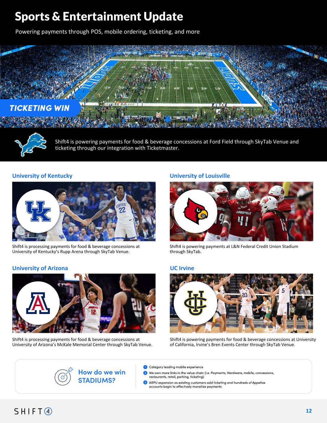 1 2 12 Shift4 is processing payments for food & beverage concessions at University of Arizona’s McKale Memorial Center through SkyTab Venue. University of Arizona UC Irvine Sports & Entertainment Update Powering payments through POS, mobile ordering, ticketing, and more Shift4 is powering payments for food & beverage concessions at University of California, Irvine’s Bren Events Center through SkyTab Venue. NOW WITH TICKETING University of LouisvilleUniversity of Kentucky Shift4 is processing payments for food & beverage concessions at University of Kentucky’s Rupp Arena through SkyTab Venue. Shift4 is powering payments at L&N Federal Credit Union Stadium through SkyTab. ++2 university of arizona UC Irvine Shift4 is powering payments for food & beverage concessions at Ford Field through SkyTab Venue and ticketing through our integration with Ticketmaster.