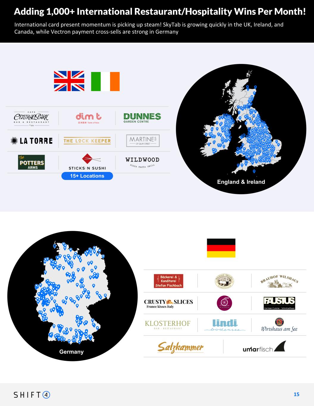 Shift4 continues to move Boldly Forward towards becoming a truly global company 1 5 • Restaurants - SKYTAB + VECTRON ◦ UK ▪ Crolla Ice cream ▪ The Moot Bar Ltd ▪ Barton Fish and Chips ▪ Bridgend Ravens Rugby Club Ltd ▪ The Crown Hotel ▪ The big jug ▪ The Embassy Hotel, Hull ▪ Tree House ▪ Billycan Tenby ▪ Brack Burger ▪ So Salsa Tapas Restaurants ◦ Ireland ▪ Taylors bar and beer garden ▪ The Phoenix Bar ▪ The Old Rectory ▪ Clancys Pub ▪ Hup Street Food ◦ Canada ▪ The Bertossi Group ▪ Cheers Beverage Room ▪ Chicken Chef ▪ The Happy Baker ▪ Yavis Family Restaurant ▪ Richibucto River Wine Eestate ▪ New England Pizza Company ▪ Social 99 - Burlington ▪ Smoke's Poutinerie (27 locations) ▪ The Roxy - Vancouver ◦ Germany - Vectron Wins ▪ Sojubar ▪ Pistazio ▪ Cafe Wortner ▪ Heberer Traditional Bakery - 160+ locations ▪ 1328 Restaurant & Bar ▪ Coffee Baum ▪ Blumencafe ▪ Estia Restaurant ▪ Bäckerei Diener - 8 locations ▪ El Rancho Eschweiler ▪ Kaska Grill Restaurant ▪ Inci Fisch und Seafood Restaurant ▪ Hofladen Cremerius GbR ▪ Gelato Mio - 6 locations ▪ Hasir Group - 10 locatins 15 Adding 1,000+ International Restaurant/Hospitality Wins Per Month! International card present momentum is picking up steam! SkyTab is growing quickly in the UK, Ireland, and Canada, while Vectron payment cross-sells are strong in Germany 15+ Locations 15+ Locations 150+ Locations Germany England & Ireland We now have full control of Vectron, and had nearly 800 cross-sells in Q2 Crusty Slices, Wirthaus am See, Baeckerei- Konditorei, Backerei Suwolto, Brauhof Wilshaus, Cafe alte Pletschmuhle, Salzkammer Restaurant, Restaurant Faustus, Umar Fisch Restaurant, Lindi Bodensee gbr, Klosterhof Soflingen Ramping UK/Ireland presence quickly with nearly 3,000 SkyTab deals in the UK & Ireland Wildwood Restaurants, Sticks N Sushi, Dim T, Central Park Cafe, Dunnes Garden Center, LaTorre Restaurant, Lock Keeper Pub, Martines Restaurant, Potters Arms