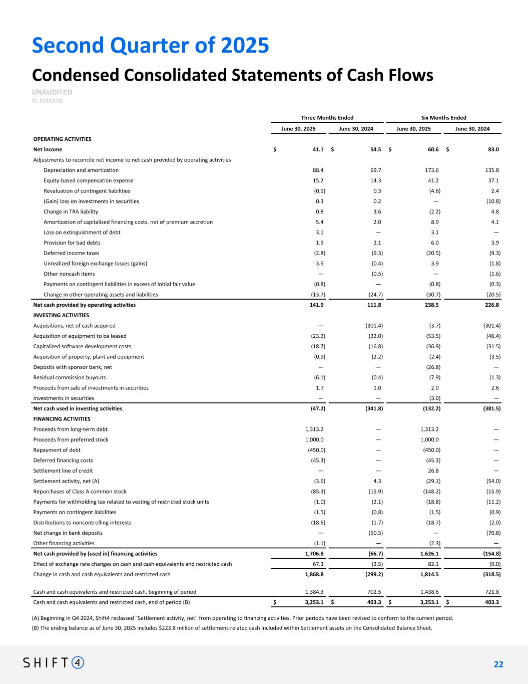 Second Quarter of 2025 Condensed Consolidated Statements of Cash Flows UNAUDITED In millions Three Months Ended Six Months Ended June 30, 2025 June 30, 2024 June 30, 2025 June 30, 2024 OPERATING ACTIVITIES Net income $ 41.1 $ 54.5 $ 60.6 $ 83.0 Adjustments to reconcile net income to net cash provided by operating activities Depreciation and amortization 88.4 69.7 173.6 135.8 Equity-based compensation expense 15.2 14.3 41.2 37.1 Revaluation of contingent liabilities (0.9) 0.3 (4.6) 2.4 (Gain) loss on investments in securities 0.3 0.2 — (10.8) Change in TRA liability 0.8 3.6 (2.2) 4.8 Amortization of capitalized financing costs, net of premium accretion 5.4 2.0 8.9 4.1 Loss on extinguishment of debt 3.1 — 3.1 — Provision for bad debts 1.9 2.1 6.0 3.9 Deferred income taxes (2.8) (9.3) (20.5) (9.3) Unrealized foreign exchange losses (gains) 3.9 (0.4) 3.9 (1.8) Other noncash items — (0.5) — (1.6) Payments on contingent liabilities in excess of initial fair value (0.8) — (0.8) (0.3) Change in other operating assets and liabilities (13.7) (24.7) (30.7) (20.5) Net cash provided by operating activities 141.9 111.8 238.5 226.8 INVESTING ACTIVITIES Acquisitions, net of cash acquired — (301.4) (3.7) (301.4) Acquisition of equipment to be leased (23.2) (22.0) (53.5) (46.4) Capitalized software development costs (18.7) (16.8) (36.9) (31.5) Acquisition of property, plant and equipment (0.9) (2.2) (2.4) (3.5) Deposits with sponsor bank, net — — (26.8) — Residual commission buyouts (6.1) (0.4) (7.9) (1.3) Proceeds from sale of investments in securities 1.7 1.0 2.0 2.6 Investments in securities — — (3.0) — Net cash used in investing activities (47.2) (341.8) (132.2) (381.5) FINANCING ACTIVITIES Proceeds from long-term debt 1,313.2 — 1,313.2 — Proceeds from preferred stock 1,000.0 — 1,000.0 — Repayment of debt (450.0) — (450.0) — Deferred financing costs (45.3) — (45.3) — Settlement line of credit — — 26.8 — Settlement activity, net (A) (3.6) 4.3 (29.1) (54.0) Repurchases of Class A common stock (85.3) (15.9) (148.2) (15.9) Payments for withholding tax related to vesting of restricted stock units (1.0) (2.1) (18.8) (11.2) Payments on contingent liabilities (1.5) (0.8) (1.5) (0.9) Distributions to noncontrolling interests (18.6) (1.7) (18.7) (2.0) Net change in bank deposits — (50.5) — (70.8) Other financing activities (1.1) — (2.3) — Net cash provided by (used in) financing activities 1,706.8 (66.7) 1,626.1 (154.8) Effect of exchange rate changes on cash and cash equivalents and restricted cash 67.3 (2.5) 82.1 (9.0) Change in cash and cash equivalents and restricted cash 1,868.8 (299.2) 1,814.5 (318.5) Cash and cash equivalents and restricted cash, beginning of period 1,384.3 702.5 1,438.6 721.8 Cash and cash equivalents and restricted cash, end of period (B) $ 3,253.1 $ 403.3 $ 3,253.1 $ 403.3 2 2 22 (A) Beginning in Q4 2024, Shift4 reclassed "Settlement activity, net" from operating to financing activities. Prior periods have been revised to conform to the current period. (B) The ending balance as of June 30, 2025 includes $223.8 million of settlement-related cash included within Settlement assets on the Consolidated Balance Sheet.