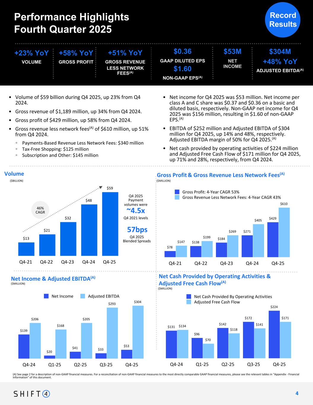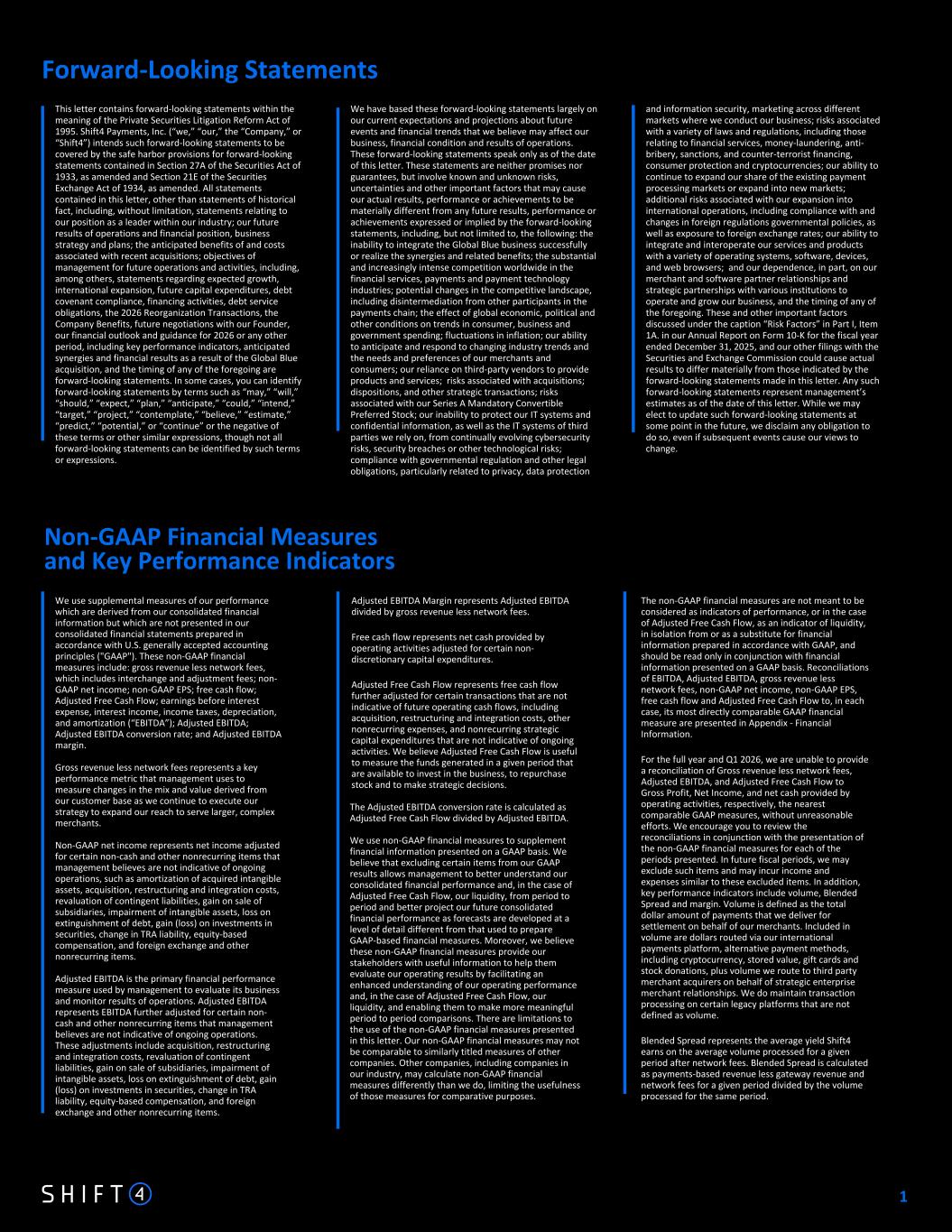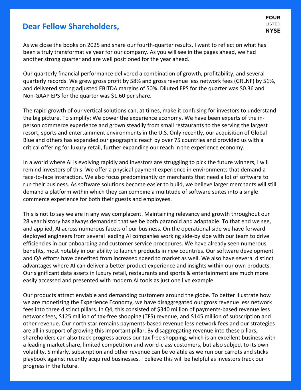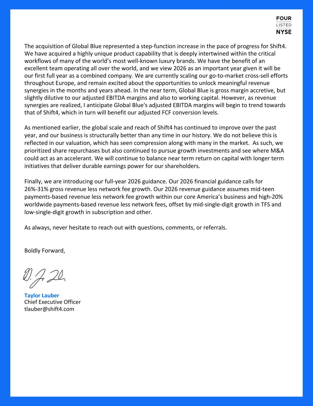 Dear Fellow Shareholders, Jared Isaacman CEO jared@shift4.com As we close the books on 2025 and share our fourth-quarter results, I want to reflect on what has been a truly transformative year for our company. As you will see in the pages ahead, we had another strong quarter and are well positioned for the year ahead. Our quarterly financial performance delivered a combination of growth, profitability, and several quarterly records. We grew gross profit by 58% and gross revenue less network fees (GRLNF) by 51%, and delivered strong adjusted EBITDA margins of 50%. Diluted EPS for the quarter was $0.36 and Non-GAAP EPS for the quarter was $1.60 per share. The rapid growth of our vertical solutions can, at times, make it confusing for investors to understand the big picture. To simplify: We power the experience economy. We have been experts of the in- person commerce experience and grown steadily from small restaurants to the serving the largest resort, sports and entertainment environments in the U.S. Only recently, our acquisition of Global Blue and others has expanded our geographic reach by over 75 countries and provided us with a critical offering for luxury retail, further expanding our reach in the experience economy. In a world where AI is evolving rapidly and investors are struggling to pick the future winners, I will remind investors of this: We offer a physical payment experience in environments that demand a face-to-face interaction. We also focus predominantly on merchants that need a lot of software to run their business. As software solutions become easier to build, we believe larger merchants will still demand a platform within which they can combine a multitude of software suites into a single commerce experience for both their guests and employees. This is not to say we are in any way complacent. Maintaining relevancy and growth throughout our 28 year history has always demanded that we be both paranoid and adaptable. To that end we see, and applied, AI across numerous facets of our business. On the operational side we have forward deployed engineers from several leading AI companies working side-by side with our team to drive efficiencies in our onboarding and customer service procedures. We have already seen numerous benefits, most notably in our ability to launch products in new countries. Our software development and QA efforts have benefited from increased speed to market as well. We also have several distinct advantages where AI can deliver a better product experience and insights within our own products. Our significant data assets in luxury retail, restaurants and sports & entertainment are much more easily accessed and presented with modern AI tools as just one live example. Our products attract enviable and demanding customers around the globe. To better illustrate how we are monetizing the Experience Economy, we have disaggregated our gross revenue less network fees into three distinct pillars. In Q4, this consisted of $340 million of payments-based revenue less network fees, $125 million of tax-free shopping (TFS) revenue, and $145 million of subscription and other revenue. Our north star remains payments-based revenue less network fees and our strategies are all in support of growing this important pillar. By disaggregating revenue into these pillars, shareholders can also track progress across our tax free shopping, which is an excellent business with a leading market share, limited competition and world-class customers, but also subject to its own volatility. Similarly, subscription and other revenue can be volatile as we run our carrots and sticks playbook against recently acquired businesses. I believe this will be helpful as investors track our progress in the future. V4 - DRAFTS CIRCULATED VIA EMAIL (WORD DOC)