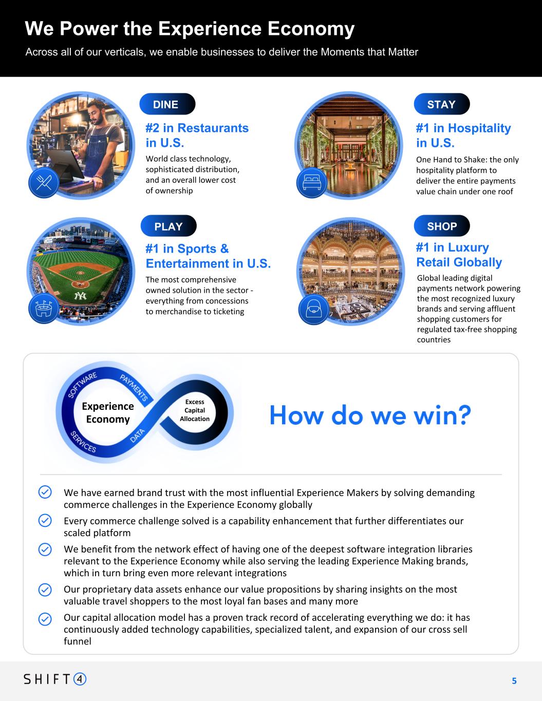 5 5 #2 in Restaurants (Menchie's) World class technology, sophisticated distribution, and an overall lower cost of ownership #1 in Hotels (Alterra) One Hand to Shake: the only hospitality platform to deliver the entire payments value chain under one roof #1 in Sports & Entertainment (Yankees) The most comprehensive owned solution in the sector - everything from concessions to merchandise Growing opportunity in Unified Commerce We are ready to grow beyond our leading verticals across the globe, and are better positioned than ever after our acquisition of Global Blue Tag line for the bottom: "We are uniquely advantaged by our category-leading products, our extensive library of software integrations, and our now $1 trillion + cross sell payments funnel. We have both a proven formula and the firepower to keep running our Shift4 Playbook all around the world for years into the future" Our growth is supported by an over $1 trillion payments cross-sell funnel, and an extensive library of software integrations #2 in Restaurants in U.S. #1 in Hospitality in U.S. #1 in Sports & Entertainment in U.S. #1 in Luxury Retail Globally World class technology, sophisticated distribution, and an overall lower cost of ownership One Hand to Shake: the only hospitality platform to deliver the entire payments value chain under one roof The most comprehensive owned solution in the sector - everything from concessions to merchandise to ticketing Global leading digital payments network powering the most recognized luxury brands and serving affluent shopping customers for regulated tax-free shopping countries Update / Adjust intro page? Loop Graphic Building and Buying Capabilities → Enhancing our Right to Win in Adjacent Verticals → Building Trust with Experience Makers with Each Success → Excess Capital Allocation in Turn Accelerates and Reinforces our Leadership We Power the Experience Economy Across all of our verticals, we enable businesses to deliver the Moments that Matter Building and Buying Capabilities Enhancing our Right to Win Across the Experience Economy Building Trust with Experience Makers with Each Success Excess Capital Allocation in Turn Accelerates and Reinforces our Leadership switch this with top half - add separation subheaders We have earned brand trust with the most influential Experience Makers by solving demanding commerce challenges in the Experience Economy globally Every commerce challenge solved is a capability enhancement that further differentiates our scaled platform We benefit from the network effect of having one of the deepest software integration libraries relevant to the Experience Economy while also serving the leading Experience Making brands, which in turn bring even more relevant integrations Our proprietary data assets enhance our value propositions by sharing insights on the most valuable travel shoppers to the most loyal fan bases and many more Our capital allocation model has a proven track record of accelerating everything we do: it has continuously added technology capabilities, specialized talent, and expansion of our cross sell funnel DINE STAY PLAY SHOP Excess Capital Allocation Experience Economy