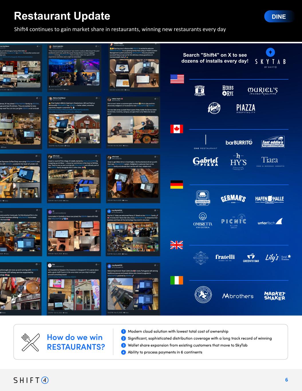 6 Over 55,000 Search "Shift4" on X to see dozens of installs every day! since coming out of beta, and on pace to exceed 35,000 installs in 2024 alone SkyTab installs Shift4 continues to gain market share in restaurants, winning new restaurants every day Restaurant Update Adding 1,300 international restaurant and SMB wins per month remove stat, backfill with more twitter screenshots DINE