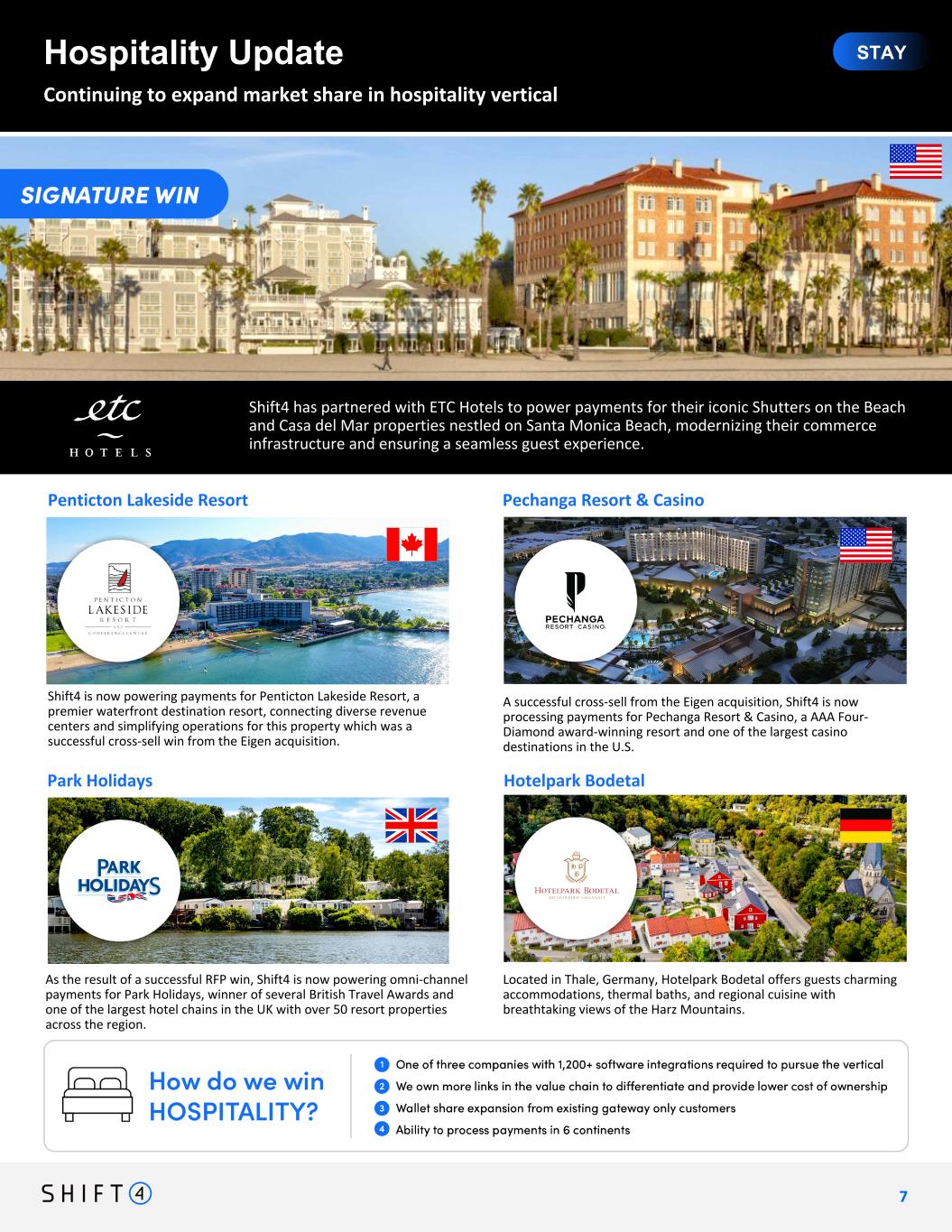Continuing to expand market share in hospitality vertical Hospitality Update 7 7 tinuing to expand market share in hospitality vertical Shift4 has partnered with ETC Hotels to power payments for their iconic Shutters on the Beach and Casa del Mar properties nestled on Santa Monica Beach, modernizing their commerce infrastructure and ensuring a seamless guest experience. A successful cross-sell from the Eigen acquisition, Shift4 is now processing payments for Pechanga Resort & Casino, a AAA Four- Diamond award-winning resort and one of the largest casino destinations in the U.S. Pechanga Resort & Casino As the result of a successful RFP win, Shift4 is now powering omni-channel payments for Park Holidays, winner of several British Travel Awards and one of the largest hotel chains in the UK with over 50 resort properties across the region. Park Holidays Located in Thale, Germany, Hotelpark Bodetal offers guests charming accommodations, thermal baths, and regional cuisine with breathtaking views of the Harz Mountains. Shift4 is now powering payments for Penticton Lakeside Resort, a premier waterfront destination resort, connecting diverse revenue centers and simplifying operations for this property which was a successful cross-sell win from the Eigen acquisition. Penticton Lakeside Resort Hotelpark Bodetal STAY