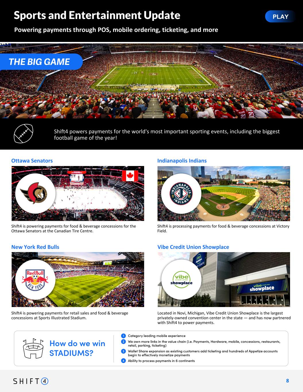 8 8 Shift4 is powering payments for retail sales and food & beverage concessions at Sports Illustrated Stadium. New York Red Bulls Vibe Credit Union Showplace Sports and Entertainment Update Powering payments through POS, mobile ordering, ticketing, and more Located in Novi, Michigan, Vibe Credit Union Showplace is the largest privately-owned convention center in the state — and has now partnered with Shift4 to power payments. Indianapolis IndiansOttawa Senators Shift4 is powering payments for food & beverage concessions for the Ottawa Senators at the Canadian Tire Centre. Shift4 is processing payments for food & beverage concessions at Victory Field. Shift4 powers payments for the world's most important sporting events, including the biggest football game of the year! THE BIG GAME PLAY