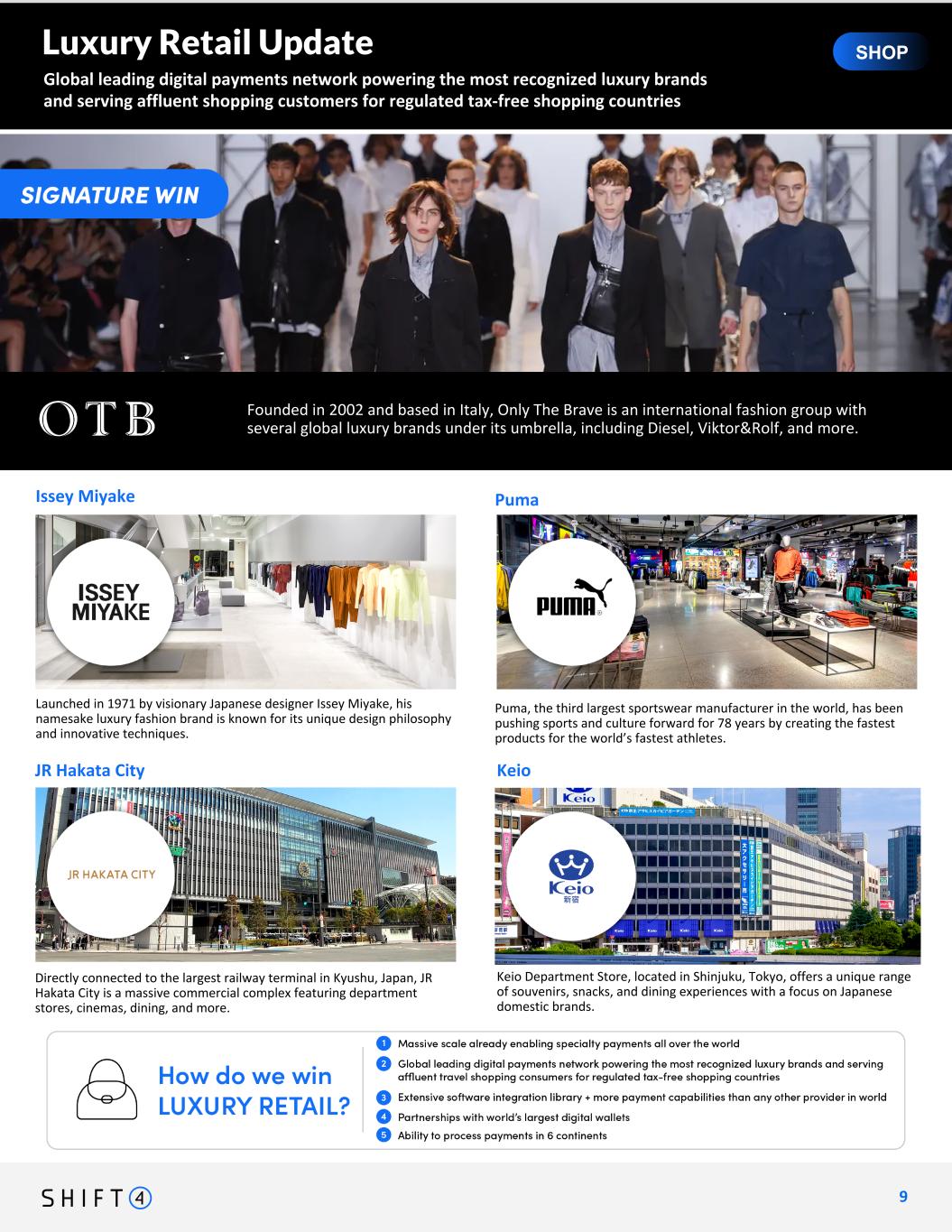 Shift4 continues to move Boldly Forward towards becoming a truly global company 9 9 Luxury Retail Update Global leading digital payments network powering the most recognized luxury brands and serving affluent shopping customers for regulated tax-free shopping countries 75K Retailers with 400K+ Locations 15M+ International Shoppers LUXURY RETAIL WINS Global Leader in Luxury Retail Payments Technology ~$500B+ EMBEDDED PAYMENTS VOLUME • TFS Take Rates [xx]bps+ • TFS Revenue Growth +[XX]% • Total Merchant Payments Volumes [x-x]x TFS SiS Q3 2025 €[xx]B Tax Free Shopping SiS [xx]% YoY growth Issey Miyake Puma JR Hakata City Groupe Printemps Directly connected to the largest railway terminal in Kyushu, Japan, JR Hakata City is a massive commercial complex featuring department stores, cinemas, dining, and more. Puma, the third largest sportswear manufacturer in the world, has been pushing sports and culture forward for 78 years by creating the fastest products for the world’s fastest athletes. Launched in 1971 by visionary Japanese designer Issey Miyake, his namesake luxury fashion brand is known for its unique design philosophy and innovative techniques. Keio Department Store, located in Shinjuku, Tokyo, offers a unique range of souvenirs, snacks, and dining experiences with a focus on Japanese domestic brands. Keio Founded in 2002 and based in Italy, Only The Brave is an international fashion group with several global luxury brands under its umbrella, including Diesel, Viktor&Rolf, and more. SHOP