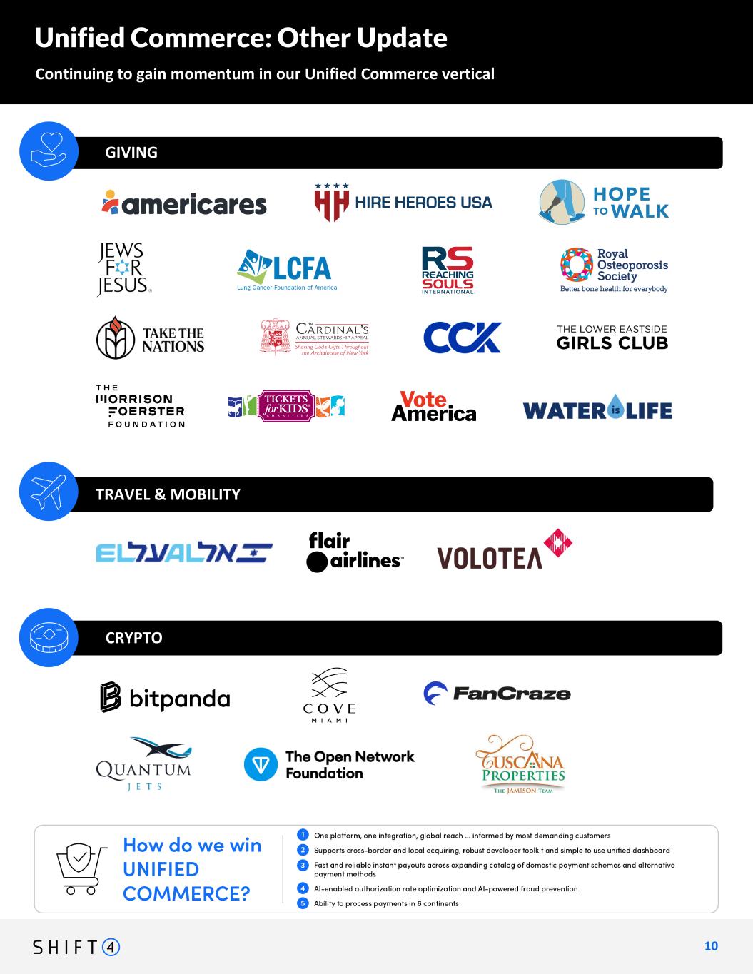 Unified Commerce: Other Update Continuing to gain momentum in our Unified Commerce vertical 1 0 10 GIVING CRYPTO GAMING TRAVEL & MOBILITY TBU WITH WINS FOR THIS QUARTER "signature win" at the top will be the XAI partnership unified commerce win that kills 2 birds with one stone - features a marquee win as well as our growing AI capabilities Water Is Life Global VoteAmerica Action Fund Tickets for Kids Charities The Morrison & Foerster Foundation The Lower East Side Girls Club of New York The Center for Courageous Kids The Cardinal's Annual Stewardship Appeal Take The Nations Royal Osteoporosis Society Reaching Souls International Lung Cancer Foundation of America Jews for Jesus Hope To Walk Hire Heroes USA Americares Crypto Wins Quantum Jets Cove Miami Tuscana Properties The Open Network Foundation (Telegram) Bitpanda Fancraze LANGUAGE TBD \ ++ other version w/o signature win