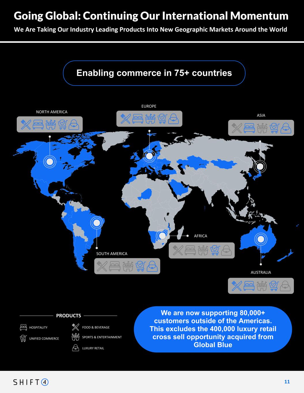 Shift4 continues to move Boldly Forward towards becoming a truly global company 1 1 11 Going Global: Continuing Our International Momentum Enabling commerce in 75+ countries We Are Taking Our Industry Leading Products Into New Geographic Markets Around the World UPDATED MAP PAGE Show we are live processing in 6 continents. went live with BYD in Latam as latest proof point of growing unified commerce platform. blue chips are coming to work with us becausee of our geo coverage and balance of card present and CNP + possibly hit curb again WHAT we need to include: -new map (map from investor day + the dark blue countries "coming soon" from this one" -callout with "We have closed on our landmark acquisition of Global Blue, expanding our footprint to 75+ countries" maybe above the map, and then maybe another one below with "Global B ue has accelerated our international expansion, and we will continue to follow our strategic partner into new geographies" COMING SOON Global Blue has accelerated our international expansion INCLUDE GEO UPDATE? (may not be new territories) NORTH AMERICA EUROPE ASIA SOUTH AMERICA AFRICA AUSTRALIA FOOD & BEVERAGE LUXURY RETAIL HOSPITALITY SPORTS & ENTERTAINMENTUNIFIED COMMERCE CURRENTLY PROCESSING FOOD & BEVERAGE GLOBAL LUXURY RETAIL HOSPITALITY SPORTS & ENTERTAINMENT UNIFIED COMMERCE PRODUCTS "Now serving XX merchants internationally" -graphic callout change (highlighted) -new stats callout "As of November 2023, we are supporting 80K+ customers outside of the Americas, on top of the 400K acquired from Global Blue We are now supporting 80,000+ customers outside of the Americas. This excludes the 400,000 luxury retail cross sell opportunity acquired from Global Blue @ justine change highlight icons to be blue To discuss: 2 callouts make this background lighter - hard to see ++ Hospitality – S&E