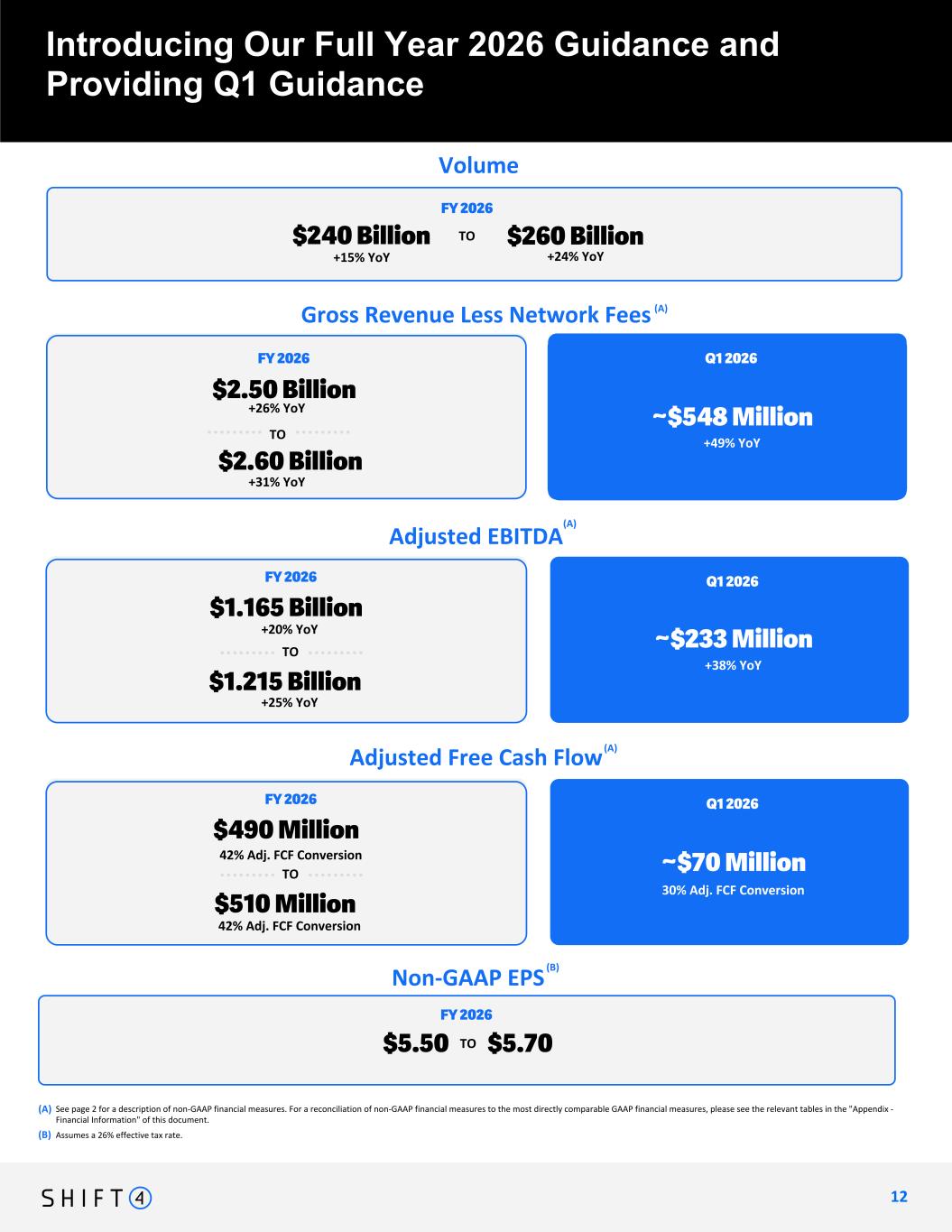 The acquisition of Global Blue represented a step-function increase in the pace of progress for Shift4. We have acquired a highly unique product capability that is deeply intertwined within the critical workflows of many of the world’s most well-known luxury brands. We have the benefit of an excellent team operating all over the world, and we view 2026 as an important year given it will be our first full year as a combined company. We are currently scaling our go-to-market cross-sell efforts throughout Europe, and remain excited about the opportunities to unlock meaningful revenue synergies in the months and years ahead. In the near term, Global Blue is gross margin accretive, but slightly dilutive to our adjusted EBITDA margins and also to working capital. However, as revenue synergies are realized, I anticipate Global Blue's adjusted EBITDA margins will begin to trend towards that of Shift4, which in turn will benefit our adjusted FCF conversion levels. As mentioned earlier, the global scale and reach of Shift4 has continued to improve over the past year, and our business is structurally better than any time in our history. We do not believe this is reflected in our valuation, which has seen compression along with many in the market. As such, we prioritized share repurchases but also continued to pursue growth investments and see where M&A could act as an accelerant. We will continue to balance near term return on capital with longer term initiatives that deliver durable earnings power for our shareholders. Finally, we are introducing our full-year 2026 guidance. Our 2026 financial guidance calls for 26%-31% gross revenue less network fee growth. Our 2026 revenue guidance assumes mid-teen payments-based revenue less network fee growth within our core America’s business and high-20% worldwide payments-based revenue less network fees, offset by mid-single-digit growth in TFS and low-single-digit growth in subscription and other. As always, never hesitate to reach out with questions, comments, or referrals. Boldly Forward, V5 - DRAFTS CIRCULATED VIA EMAIL (WORD DOC) Taylor Lauber Chief Executive Officer tlauber@shift4.com
