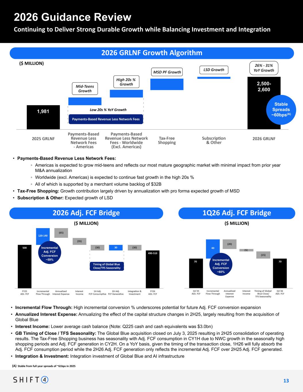 We maintain a steady merchant volume backlog of $32B+ Foundational building blocks of our durable growth 2026 Guidance Review 1 3 13 $1,981 "Our blended spreads in Q2 were 63bps" [graphic] KEEP Increased Volume and Improved Diversity Scaling and diversifying overlaying bar chart showing the GRLNF and EBITDA contribution from GB Move Up Market Average size of merchant based on volume is 363% of 2021 levels. bar chart depicting our GRLNF diversification GRLNF BRIDGE - WIP remove Stable Spreads Despite Moving Up Market and Going International Full Year 2025 blended spreads were stable at 61bps Our blended spreads in Q4 were 57ps "Consistent Volume Backlog of $XXB+" 2026 Adj. FCF Bridge 1Q26 Adj. FCF Bridge and we maintain a steady merchant volume backlog of $32B+ Merchant volume backlog of $32B+ @ justine update charts - sent snips (and see what you can do with these bullets....eek 2026 GRLNF Growth Algorithm Bullets for off to the right side or underneath if you can: -Net Payments-Based Revenue: expected to account for ~60% of GRLNF growth in 2026, with a geographic distinction between the mature Americas market (little annualization of M&A impact) and the fast-growing Worldwide (ex-Americas) market -Tax-Free Shopping: expected to account for ~40% of GRLNF growth in 2026, largely driven by the annualization given the July 3rd timing of the Global Blue acquisition close (otherwise should be viewed as delivering pro-forma MSD growth) Subscription & Other: expected to be flat for the year with quarterly volatility given composition of deprecating legacy revenue streams and payments-based conversion incentive revenues Expecting stable spreads in 2026 at 60bps+ • Payments-Based Revenue Less Network Fees: ◦ Americas is expected to grow mid-teens and reflects our most mature geographic market with minimal impact from prior year M&A annualization ◦ Worldwide (excl. Americas) is expected to continue fast growth in the high 20s % ◦ All of which is supported by a merchant volume backlog of $32B • Tax-Free Shopping: Growth contribution largely driven by annualization with pro forma expected growth of MSD • Subscription & Other: Expected growth of LSD "Payments-Based Revenue Less Network Fees" "PBRLNF - Americas" "make it look like investor day" Stable Spreads ~60bps(A) Stable from full year spreads of ~61bps in 2025(A) • Incremental Flow Through: High incremental conversion % underscores potential for future Adj. FCF conversion expansion • Annualized Interest Expense: Annualizing the effect of the capital structure changes in 2H25, largely resulting from the acquisition of Global Blue • Interest Income: Lower average cash balance (Note: Q225 cash and cash equivalents was $3.0bn) • GB Timing of Close / TFS Seasonality: The Global Blue acquisition closed on July 3, 2025 resulting in 2H25 consolidation of operating results. The Tax-Free Shopping business has seasonality with Adj. FCF consumption in CY1H due to NWC growth in the seasonally high shopping periods and Adj. FCF generation in CY2H. On a YoY basis, given the timing of the transaction close, 1H26 will fully absorb the Adj. FCF consumption period while the 2H26 Adj. FCF generation only reflects the incremental Adj. FCF over 2H25 Adj. FCF generated. • Integration & Investment: Integration investment of Global Blue and AI infrastructure ($ MILLION) ($ MILLION) Incremental Adj. FCF Conversion ~59% Incremental Adj. FCF Conversion ~60% ($ MILLION) Continuing to Deliver Strong Durable Growth while Balancing Investment and Integration $2,400 - $2,600 1,981 2,500- 2,600