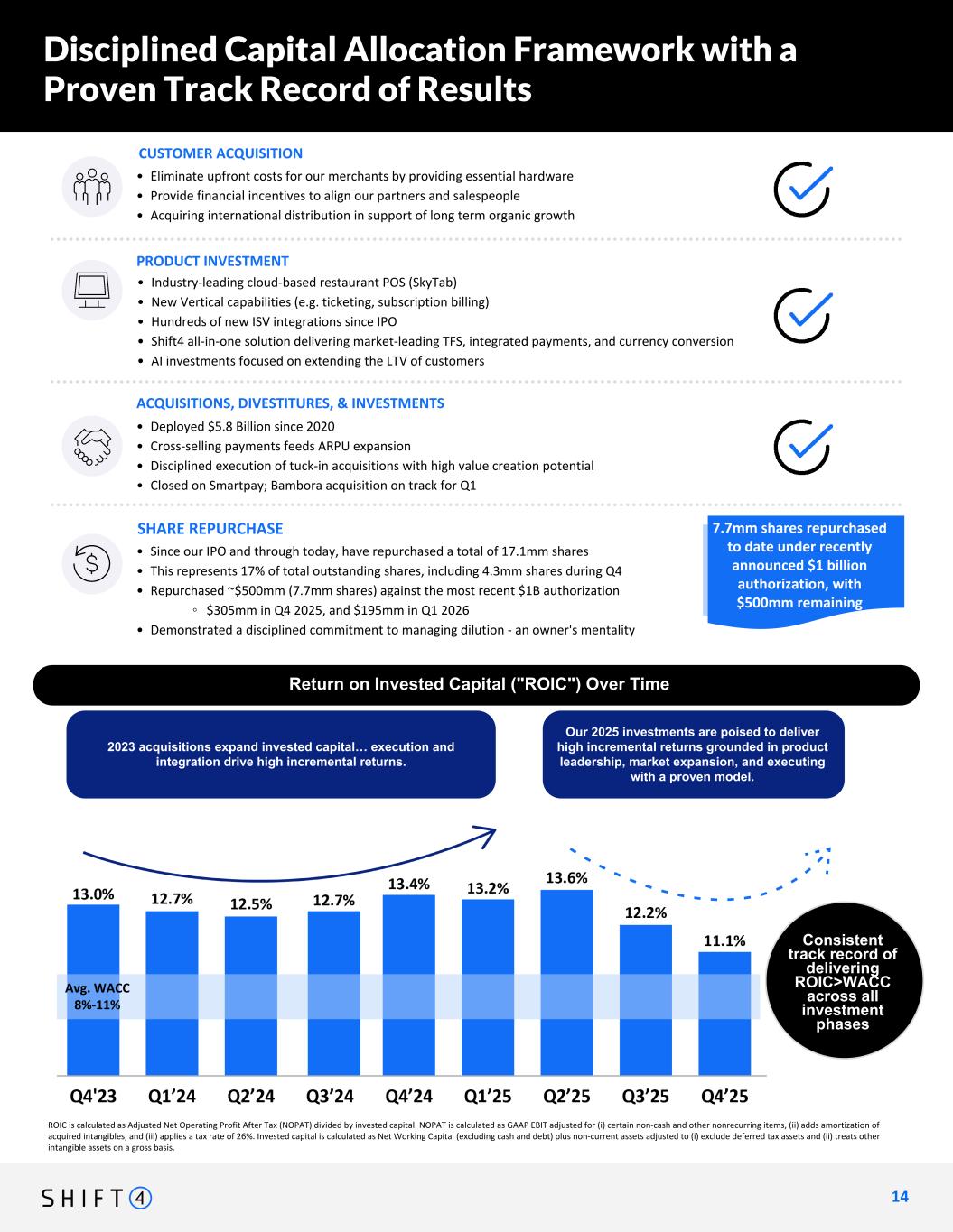 1 4 14 Proven framework for capital allocation that can deliver regardless of market backdrop Disciplined Capital Allocation Framework with a Proven Track Record of Results CUSTOMER ACQUISITION • Industry-leading cloud-based restaurant POS (SkyTab) • New Vertical capabilities (e.g. ticketing, subscription billing) • Hundreds of new ISV integrations since IPO • Shift4 all-in-one solution delivering market-leading TFS, integrated payments, and currency conversion • AI investments focused on extending the LTV of customers PRODUCT INVESTMENT • Eliminate upfront costs for our merchants by providing essential hardware • Provide financial incentives to align our partners and salespeople • Acquiring international distribution in support of long term organic growth Adjusted EBITDA Multiple of 6.2x Adjusted FCF Multiple of 10.7x Adjusted FCF Yield of 9% Total Capital Deployed: ~$5.5B(B) ACQUISITIONS, DIVESTITURES, & INVESTMENTS • Deployed $5.8 Billion since 2020 • Cross-selling payments feeds ARPU expansion • Disciplined execution of tuck-in acquisitions with high value creation potential • Closed on Smartpay; Bambora acquisition on track for Q1 SHARE REPURCHASE • Since our IPO and through today, have repurchased a total of 17.1mm shares • This represents 17% of total outstanding shares, including 4.3mm shares during Q4 • Repurchased ~$500mm (7.7mm shares) against the most recent $1B authorization ◦ $305mm in Q4 2025, and $195mm in Q1 2026 • Demonstrated a disciplined commitment to managing dilution - an owner's mentality 7.7mm shares repurchased to date under recently announced $1 billion authorization, with $500mm remaining Unlocked over $1 trillion of unmonetized payment volumes • Prior to Global Blue, Shift4 achieved an Operating ROIC of 14% (Q2 2025), delivered almost 30% incremental ROIC, and averaged xxx bps of positive spread ROIC > WACC • We anticipate ROIC to improve over time as we integrate Global Blue with an incremental ROIC of ~40% by the end of 2027 • Beyond the revenue synergies of the cross-sell, the high incremental ROIC relates to the differentiated accelerants of Global Blue's well- invested infrastructure Avg. WACC 8%-11% %s on top vs. y axis Q4 2023 - Q1 2024 - 2023 Acquisitions - Invested Capital Increase Generating high incremental return on invested capital Q2 2025 - Q4 2025 - 2025 Acquisitions - Invested Capital Increase (bubble above $ deployed) future: bar different color - dotted line with up arrow title: confidence in delivering high incremental returns grounded in our track record Focused on Value Creation Driving ROIC > WACC, Even through Periods of High Investment We have a track record of delivering ROIC > WACC, even through temporary dips during major integration periods Return on Invested Capital ("ROIC") Over Time 2023 acquisitions expand invested capital… execution and integration drive high incremental returns. Our 2025 investments are poised to deliver high incremental returns grounded in product leadership, market expansion, and executing with a proven model. Consistent track record of delivering ROIC>WACC across all investment phases ROIC is calculated as Adjusted Net Operating Profit After Tax (NOPAT) divided by invested capital. NOPAT is calculated as GAAP EBIT adjusted for (i) certain non-cash and other nonrecurring items, (ii) adds amortization of acquired intangibles, and (iii) applies a tax rate of 26%. Invested capital is calculated as Net Working Capital (excluding cash and debt) plus non-current assets adjusted to (i) exclude deferred tax assets and (ii) treats other intangible assets on a gross basis.